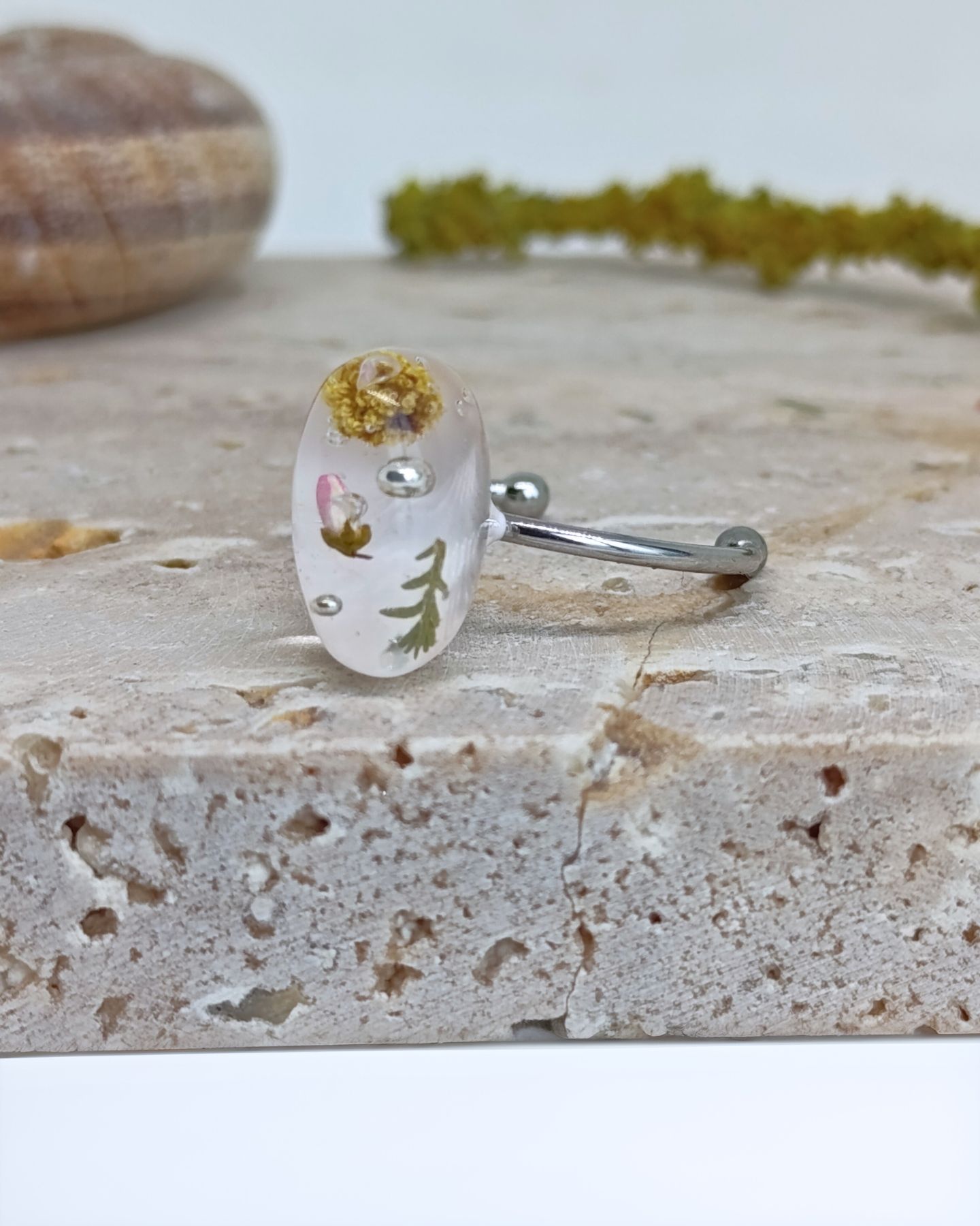 Este anillo botánico artesanal está elaborado a mano con resina de alta calidad, flores naturales y base de acero inoxidable (baño dorado o plateado).