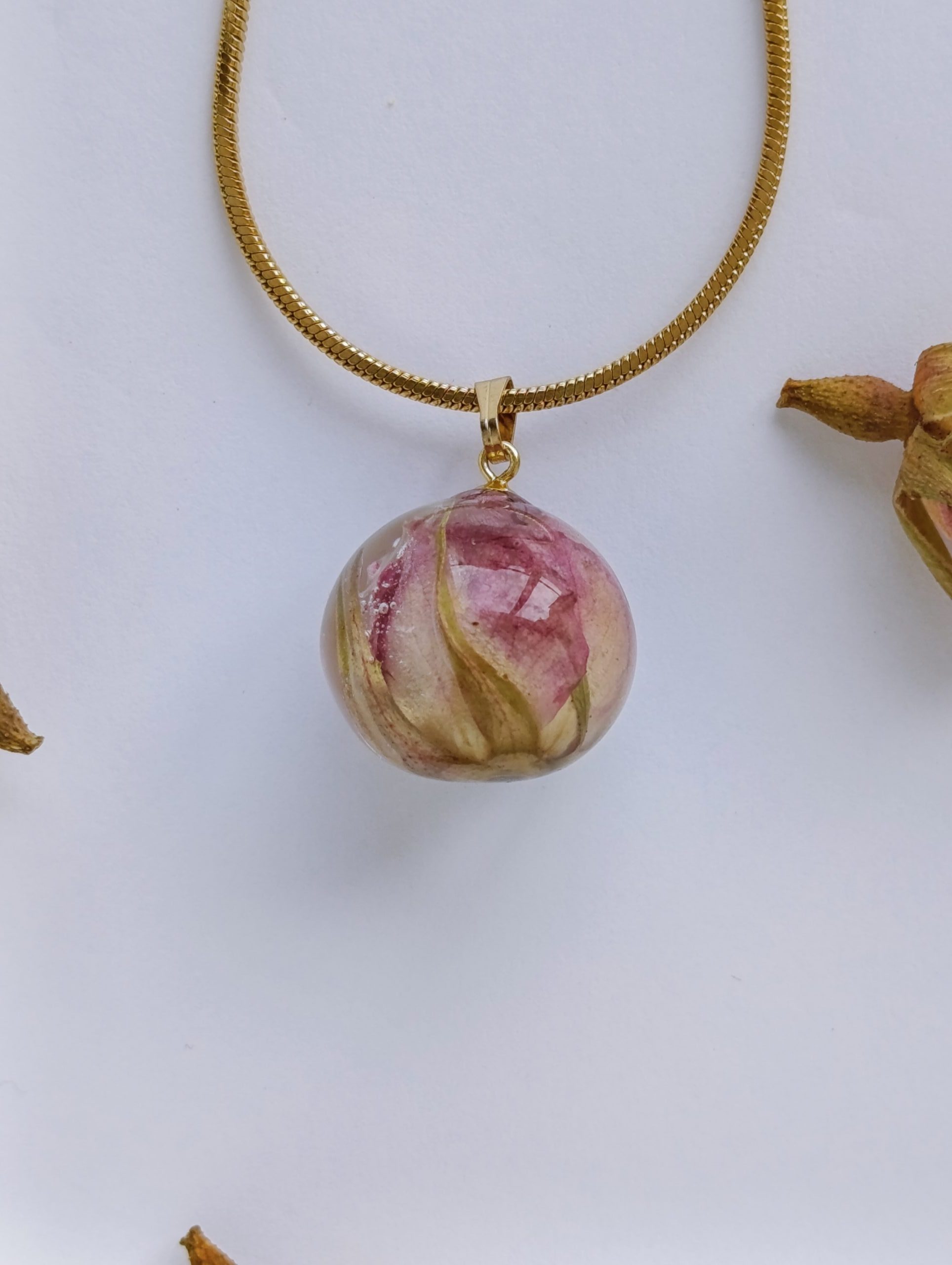 Collar de acero inoxidable con colgante de resina epoxi que encapsula una pequeña rosa, combinando elegancia y naturaleza en un diseño único.