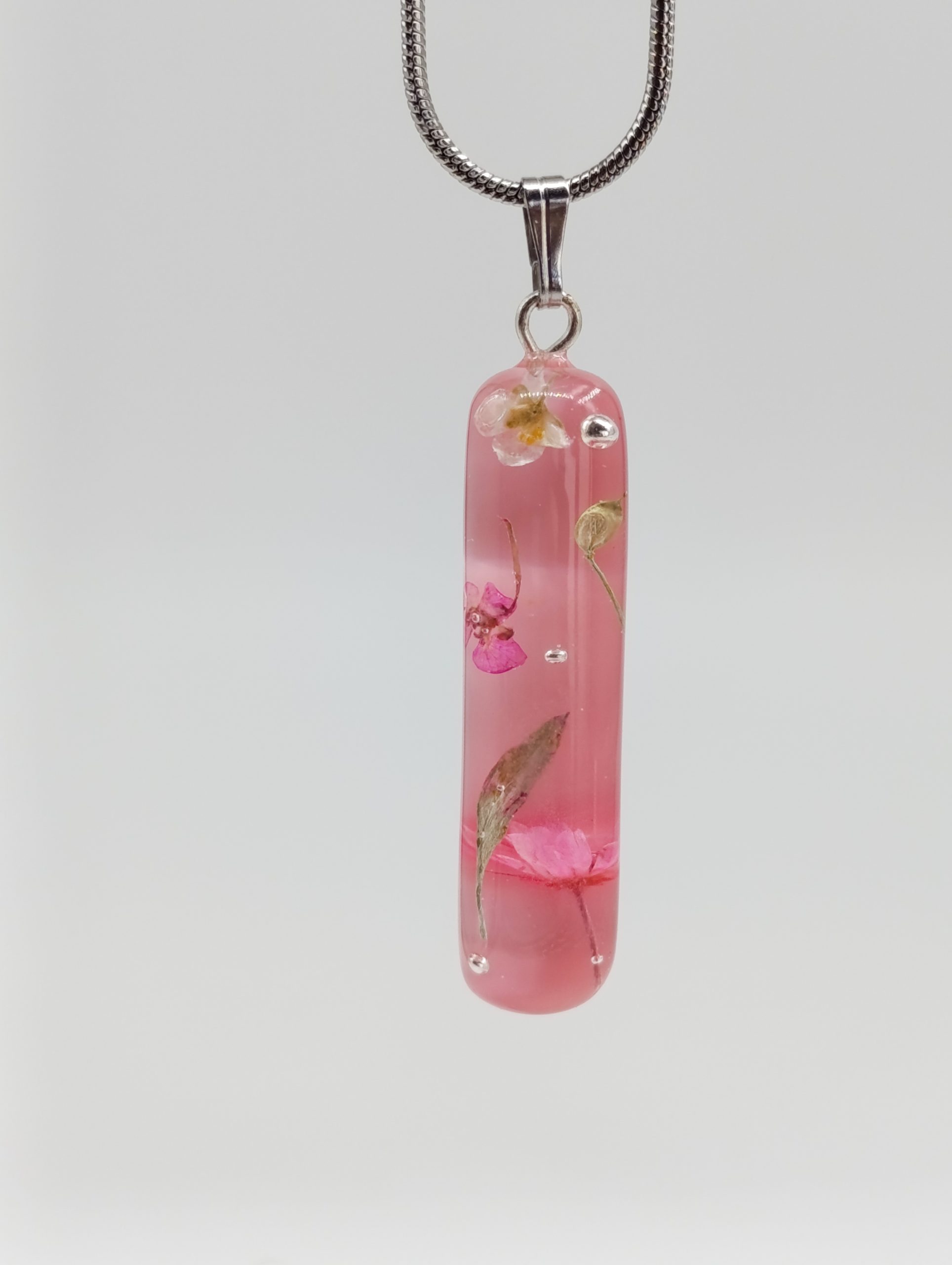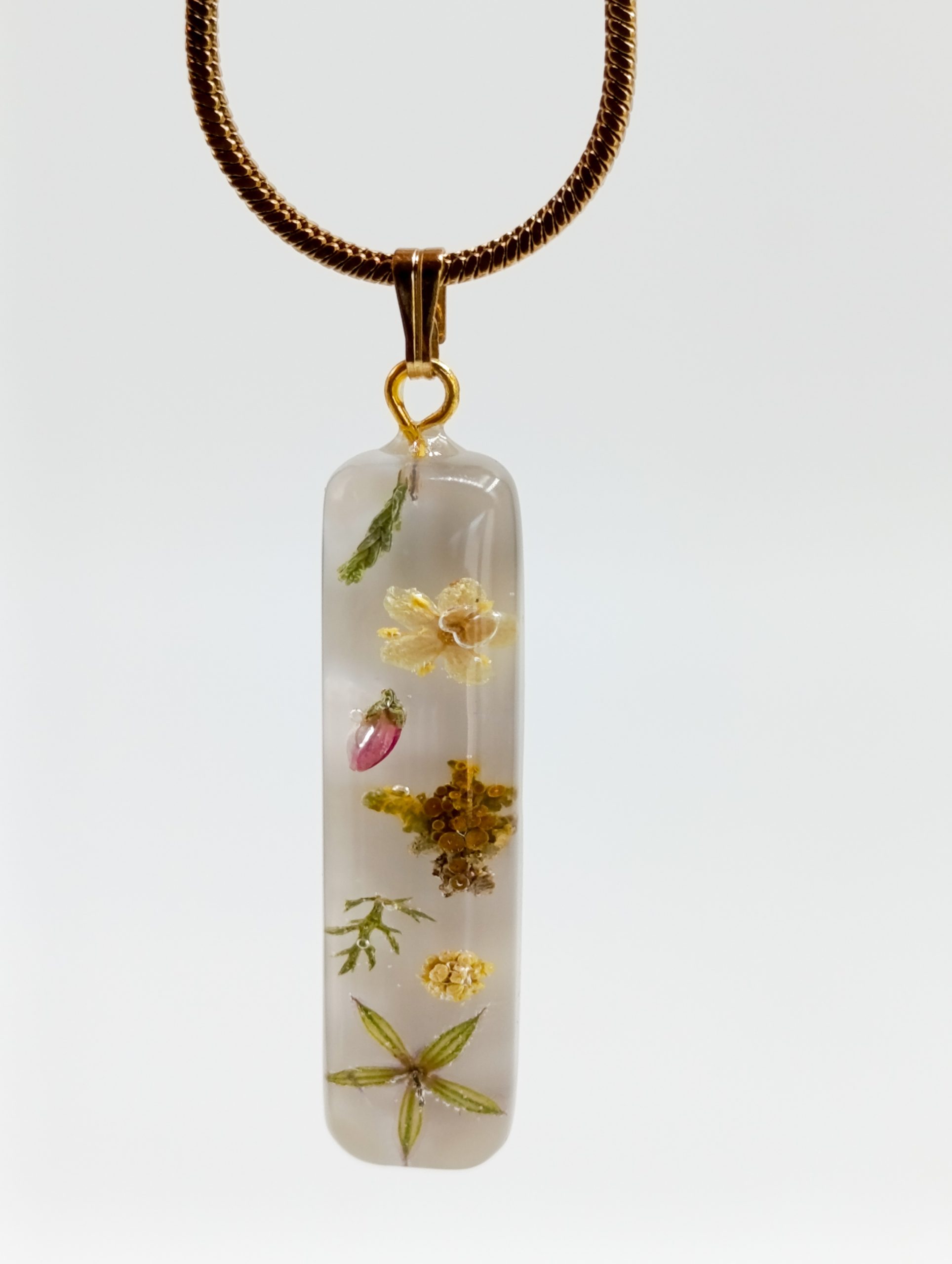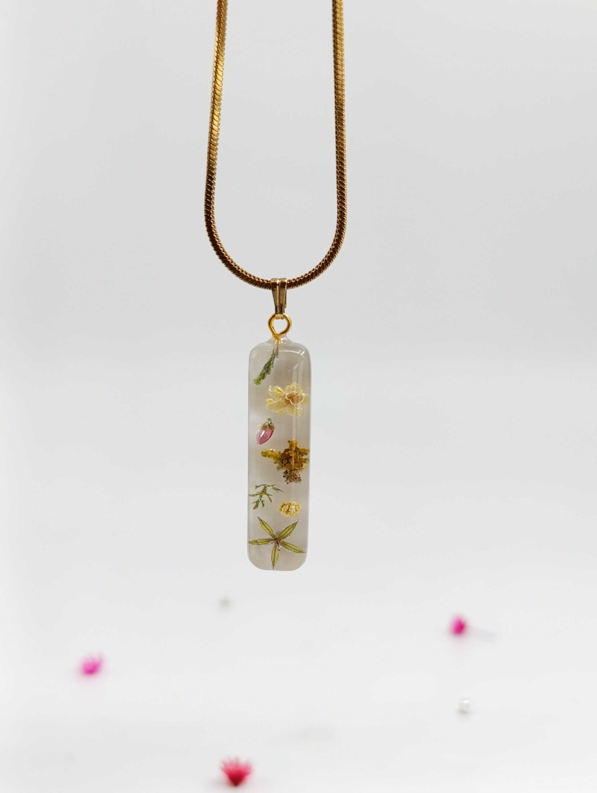 Colgante artesanal con flores naturales preservadas en resina. Cadena de acero inoxidable ajustable, diseño elegante y lleno de significado.