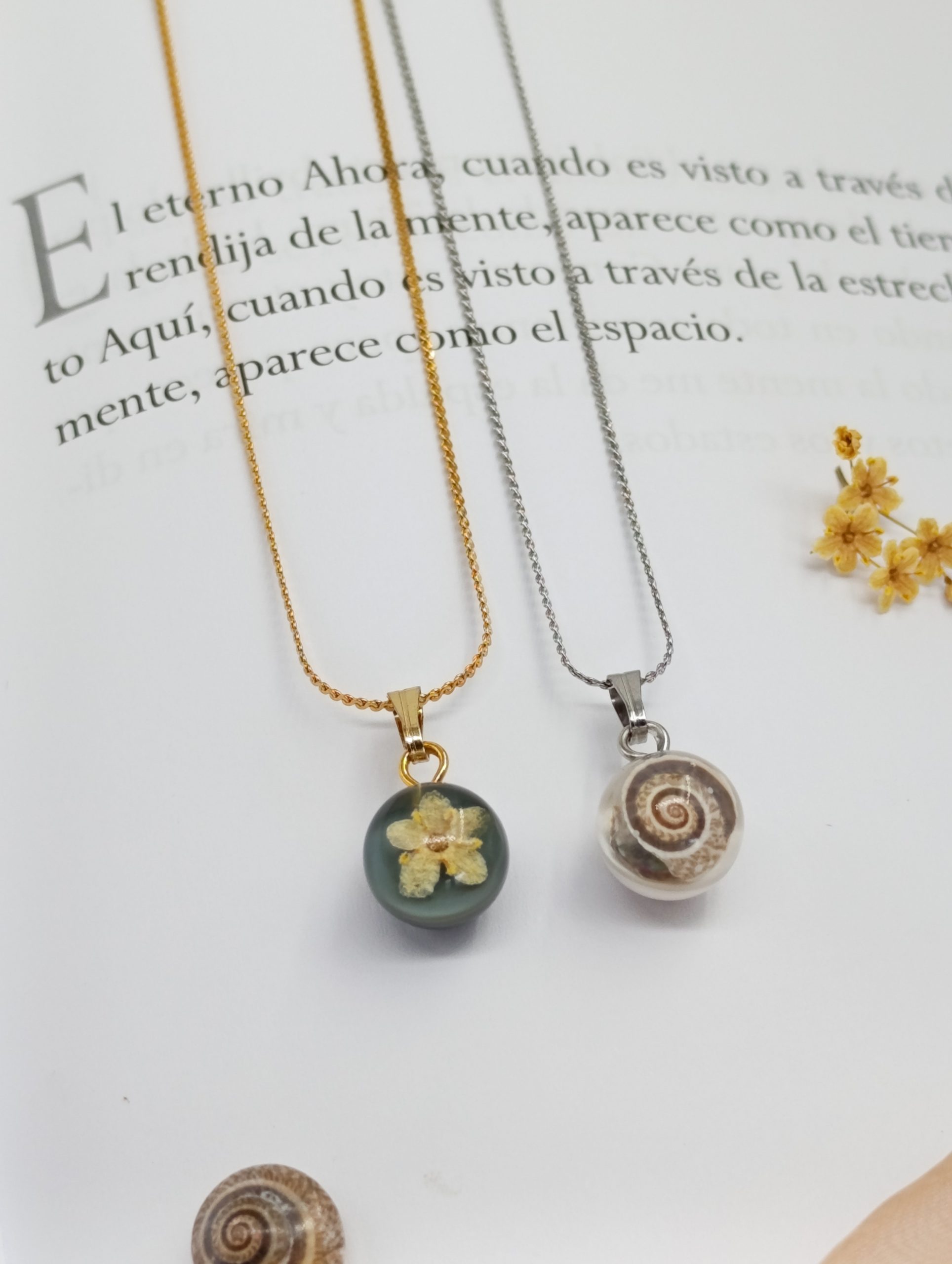 Materiales: Resina epoxi de alta calidad, elementos naturales (flores, caracol), fornituras en acero inoxidable acabado dorado o plateado.