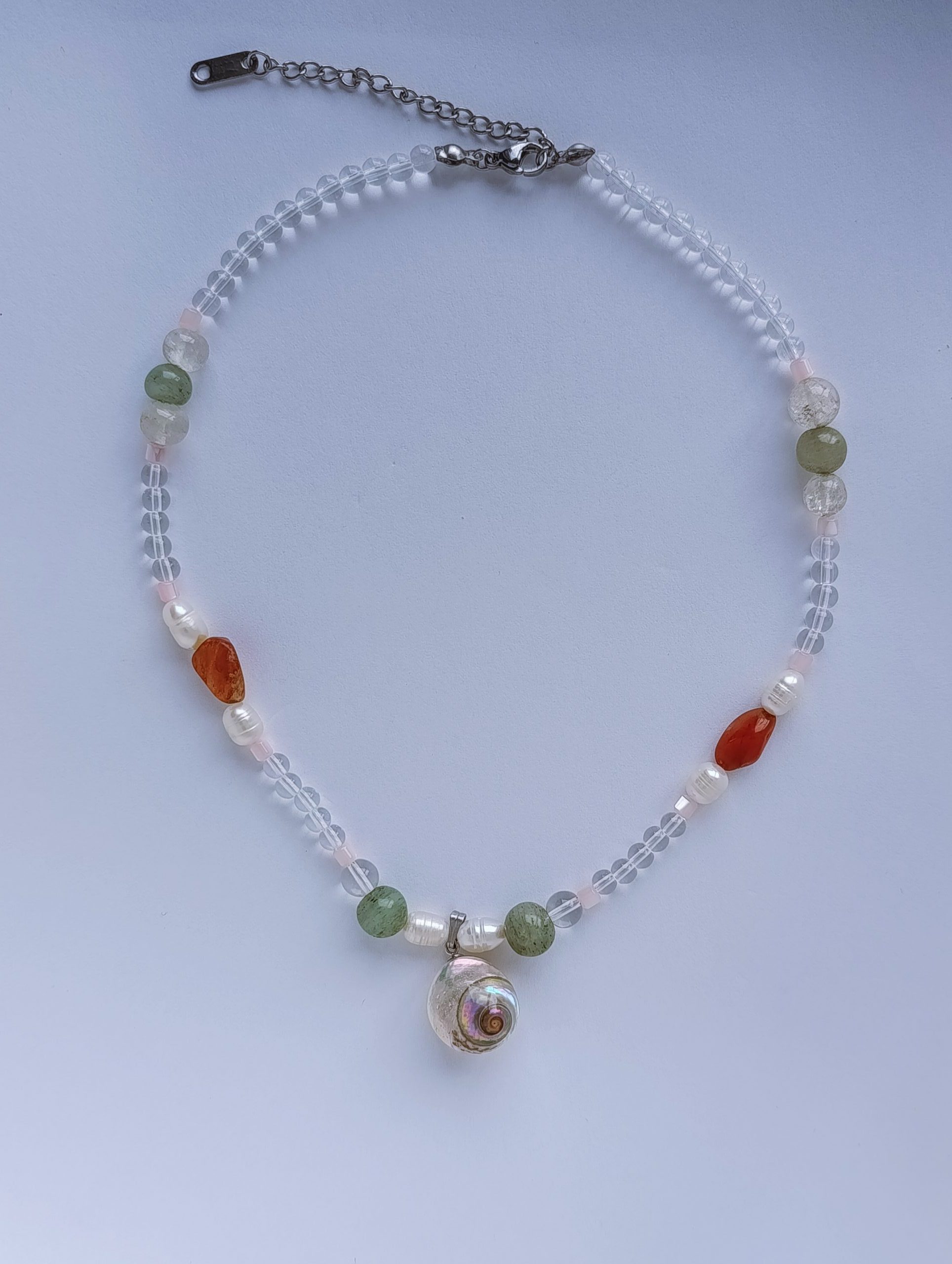 Este exclusivo collar combina cuentas de vidrio y rocalla natural con elegantes perlas de río, destacando un colgante de resina epoxi que alberga un caracol natural nacarado. Su