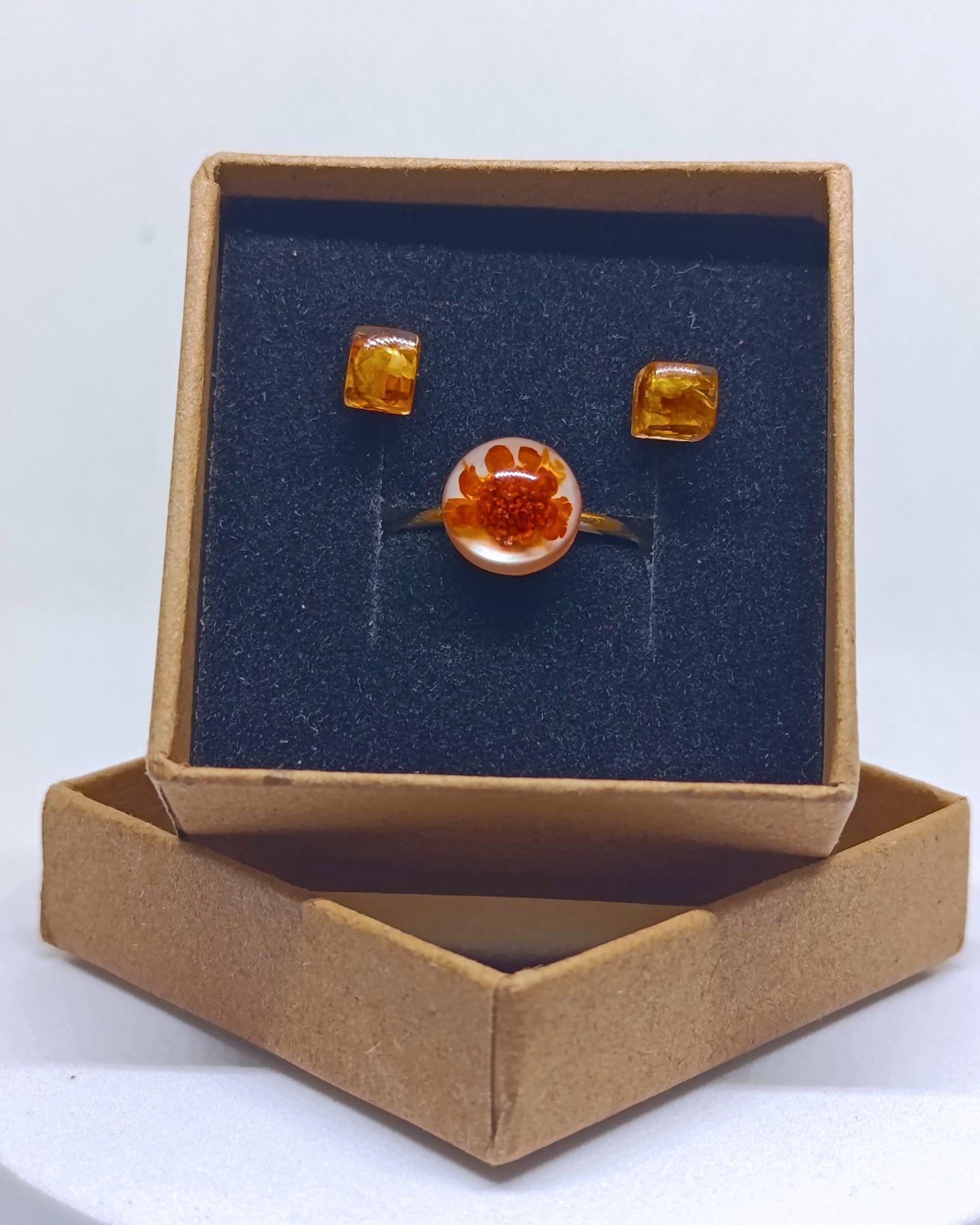 Conjunto artesanal en resina con flores de siempreviva natural. Aporta energía vital y un brillo alegre.