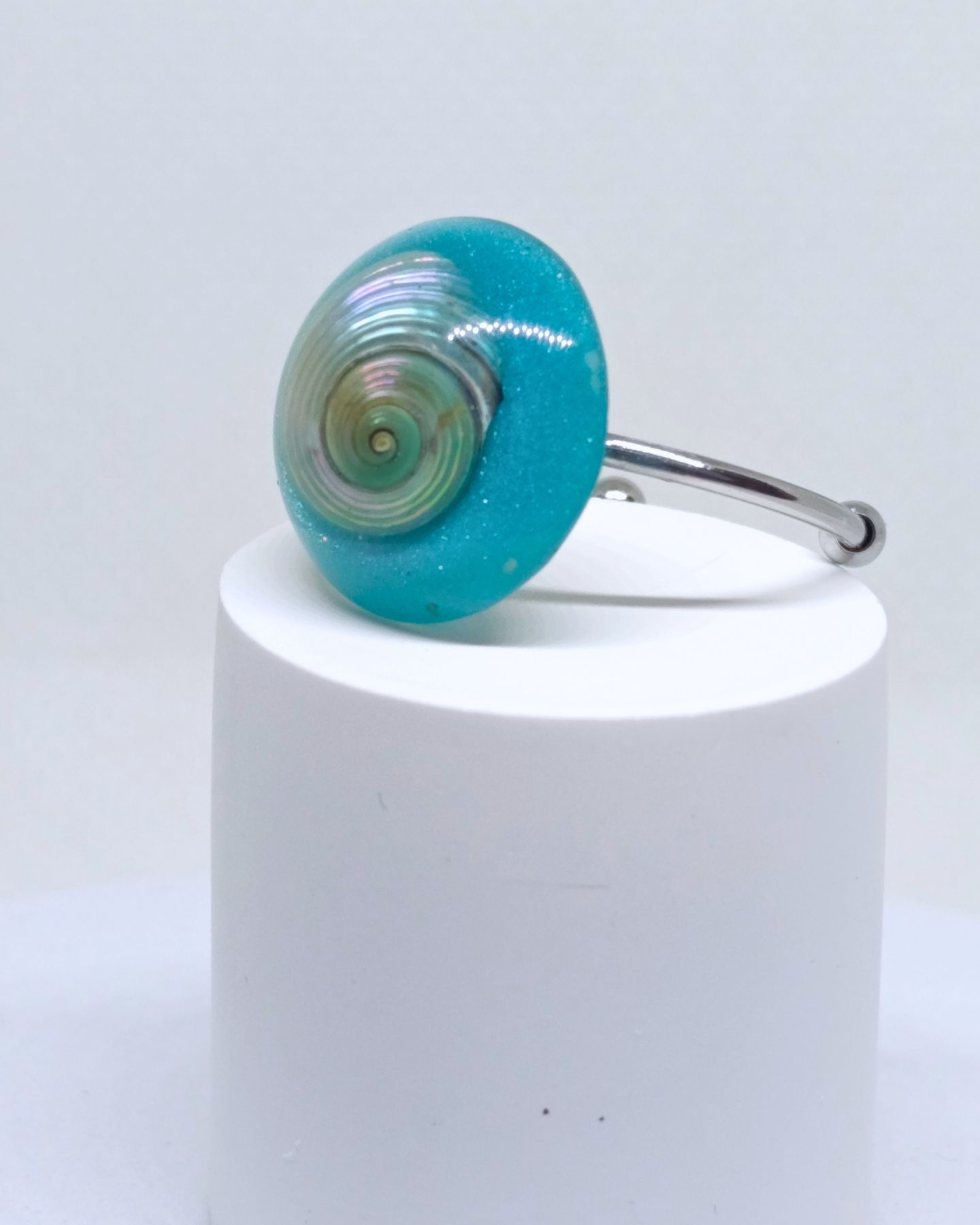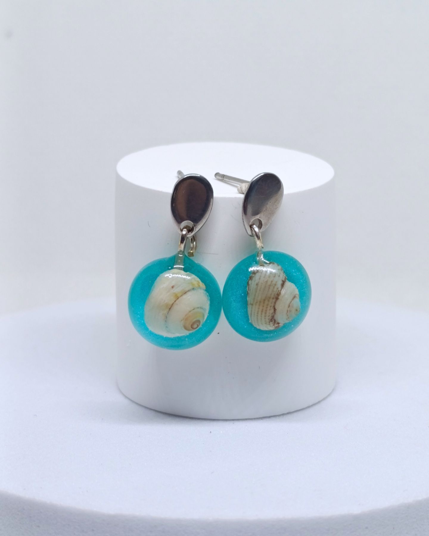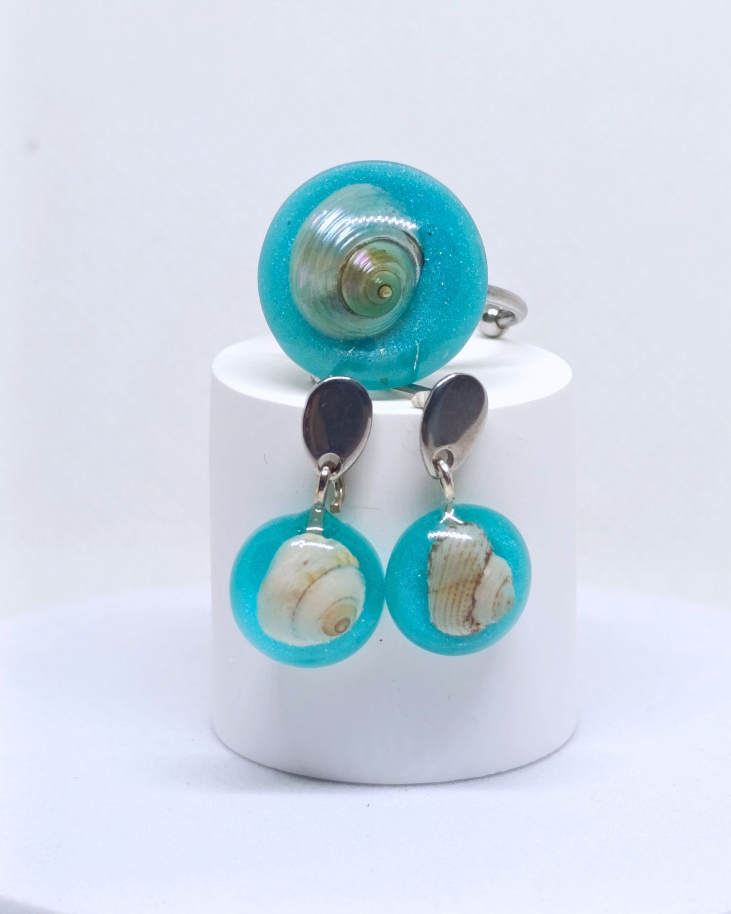 Conjunto artesanal en resina con caracolitos naturales nacarados. Calma marina y frescura mediterránea.
