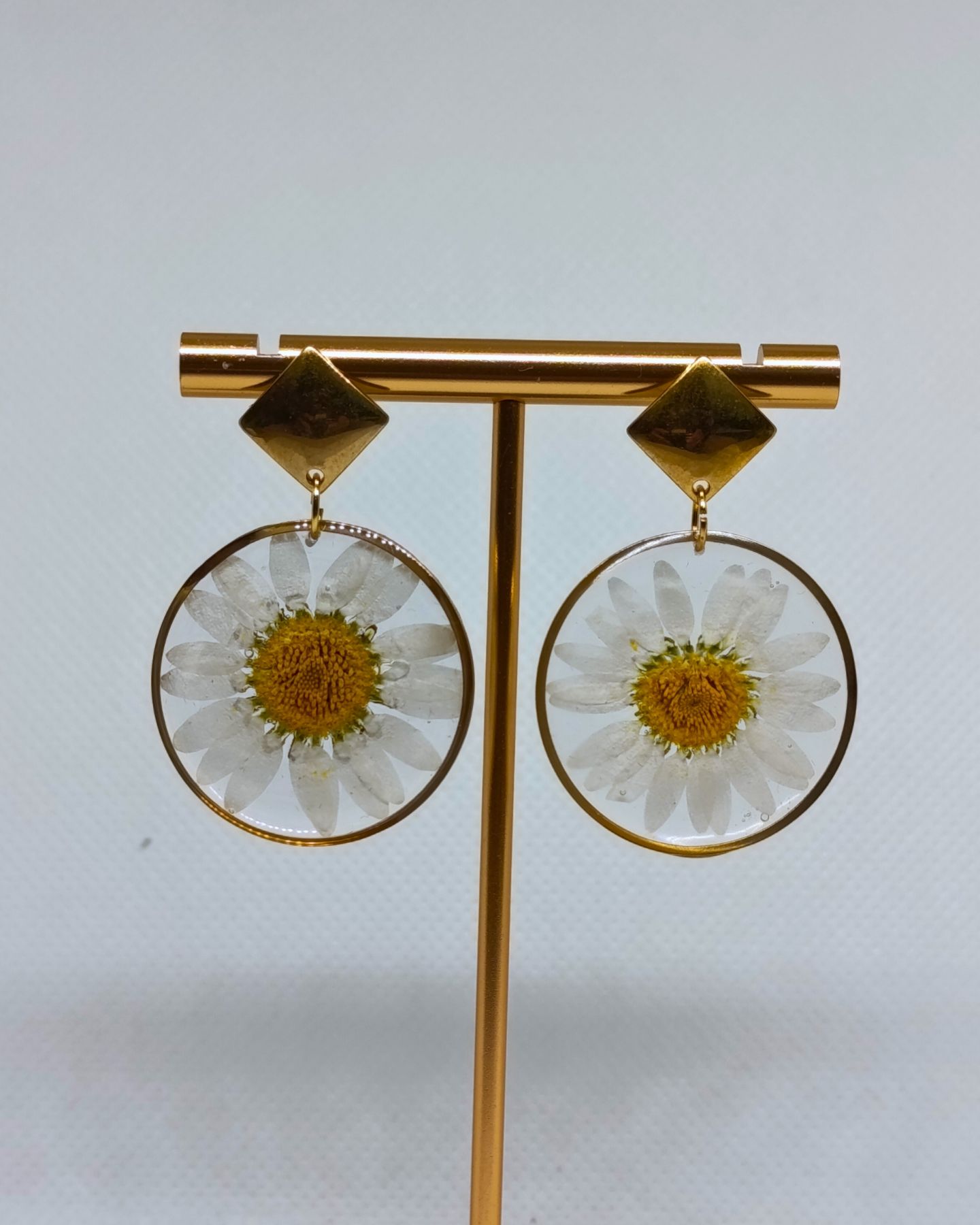 Este conjunto botánico artesanal está elaborado a mano con resina de alta calidad, margaritas naturales y bases de acero inoxidable (baño dorado o plateado).