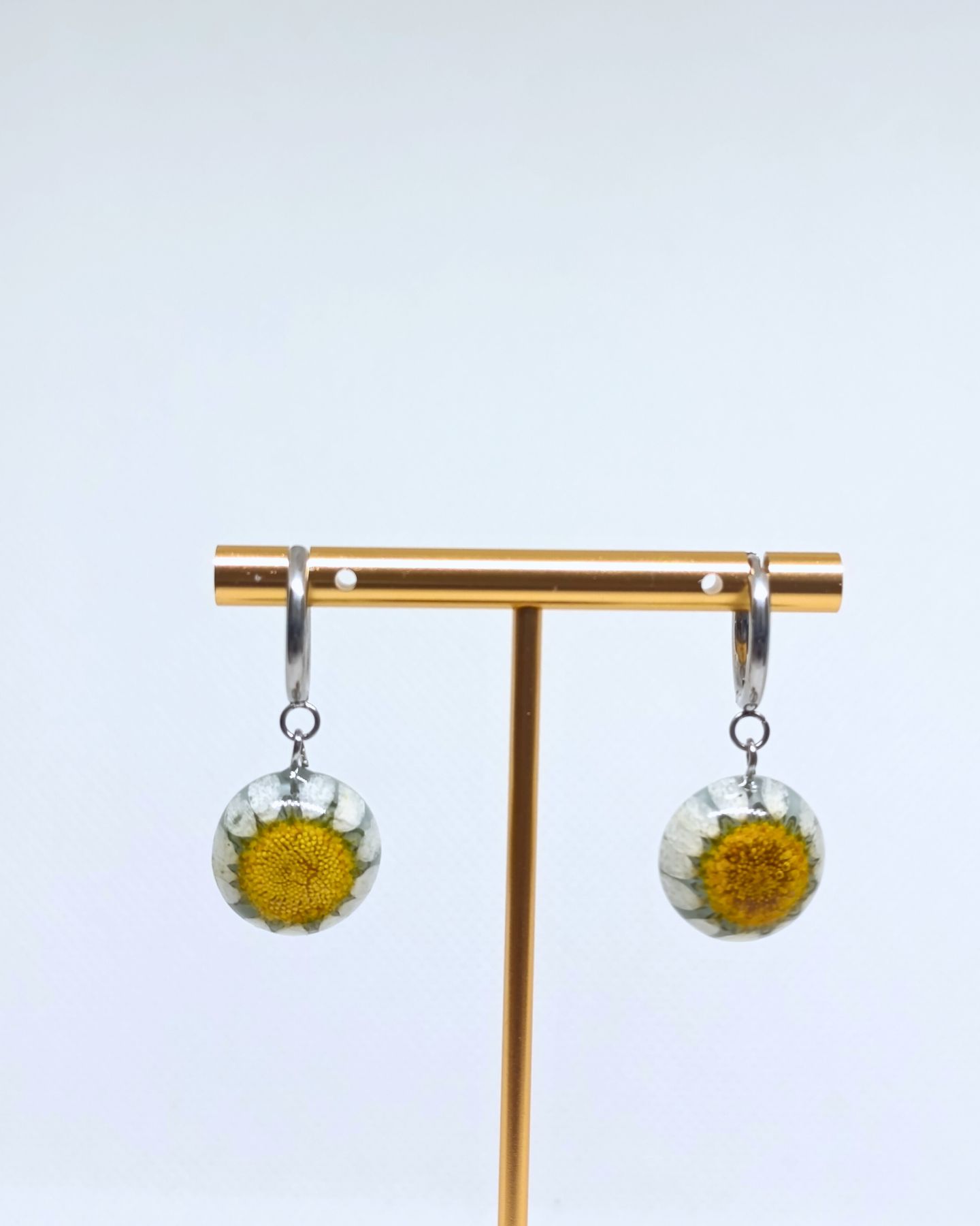 Este conjunto botánico artesanal está elaborado a mano con resina de alta calidad, margaritas naturales y bases de acero inoxidable (baño dorado o plateado).