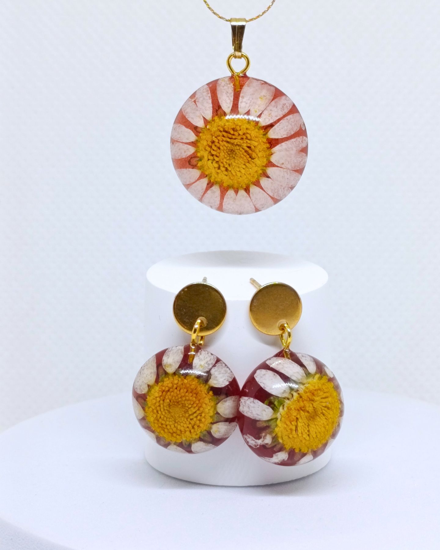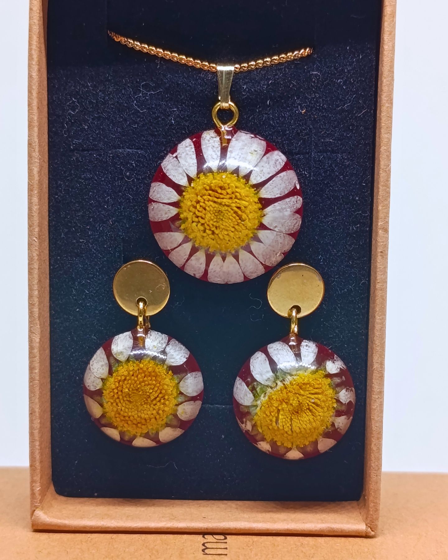 Conjunto artesanal en resina con margaritas naturales sobre fondo rojo. Pasión, vitalidad y fuerza interior.