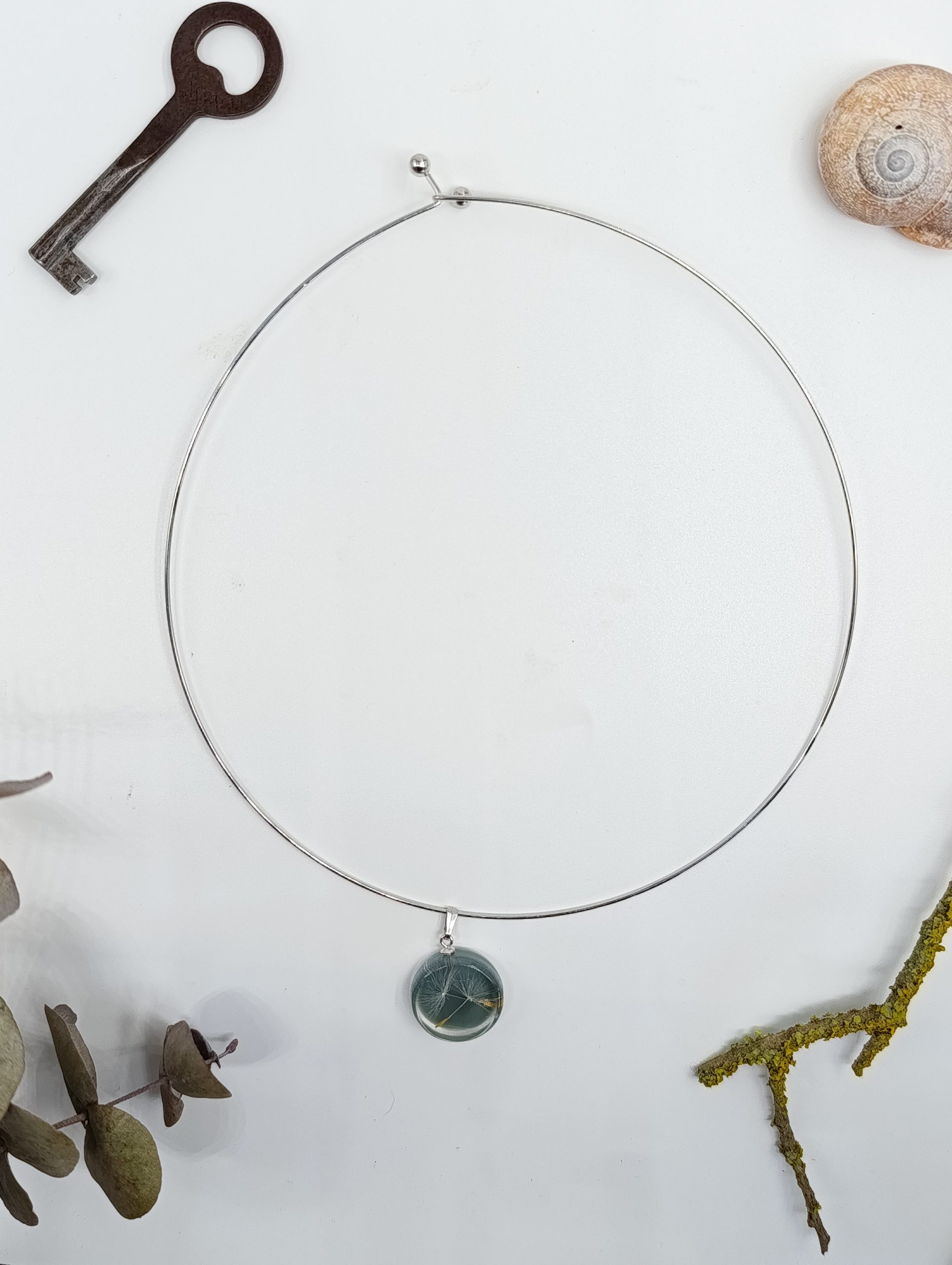 Gargantilla artesanal con semillas reales de diente de león, encapsuladas en resina epoxi de alta calidad.