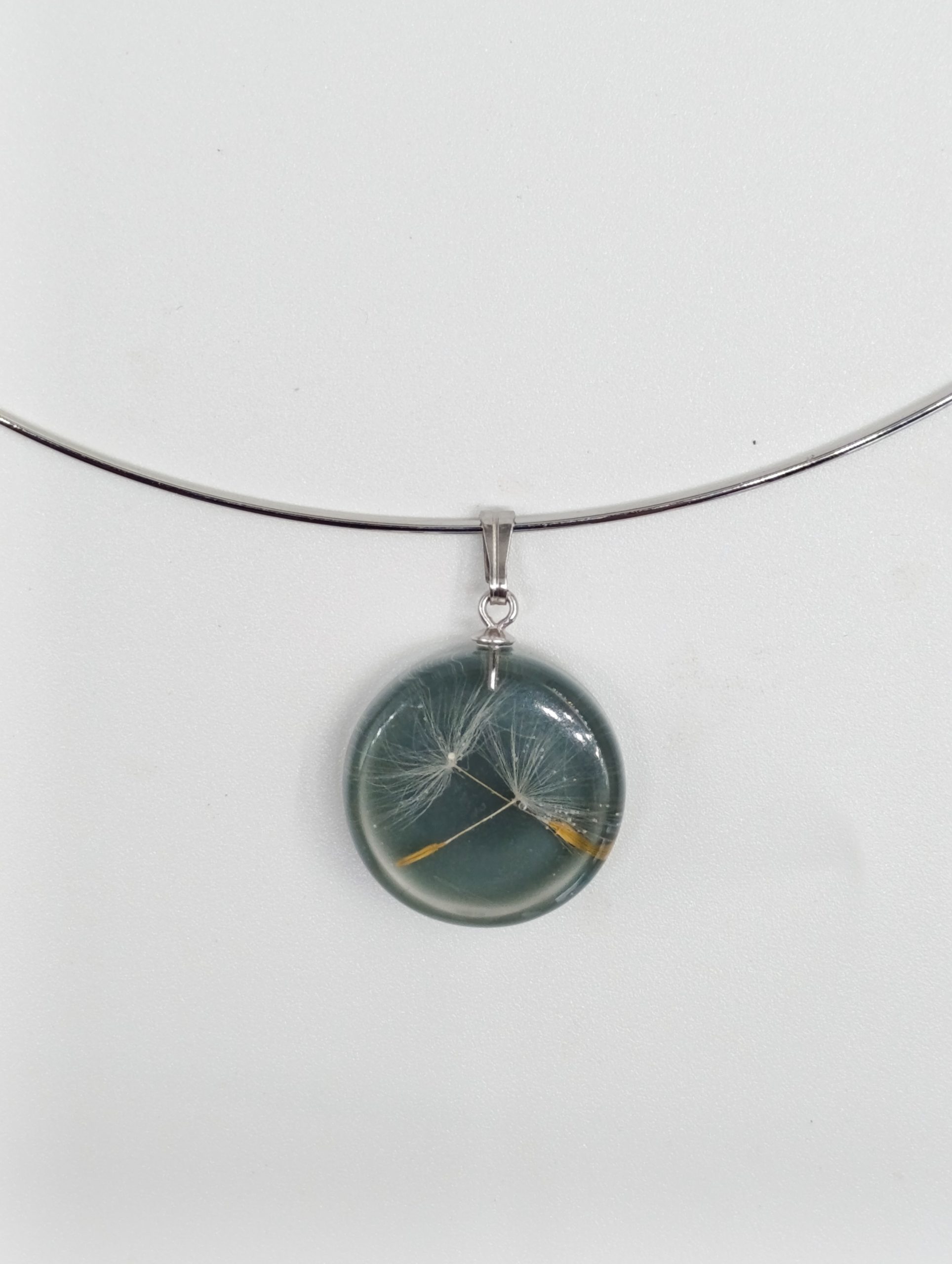 Gargantilla de resina con semillas reales de diente de león sobre fondo verde, inspirado en el instante de soplar y pedir un deseo