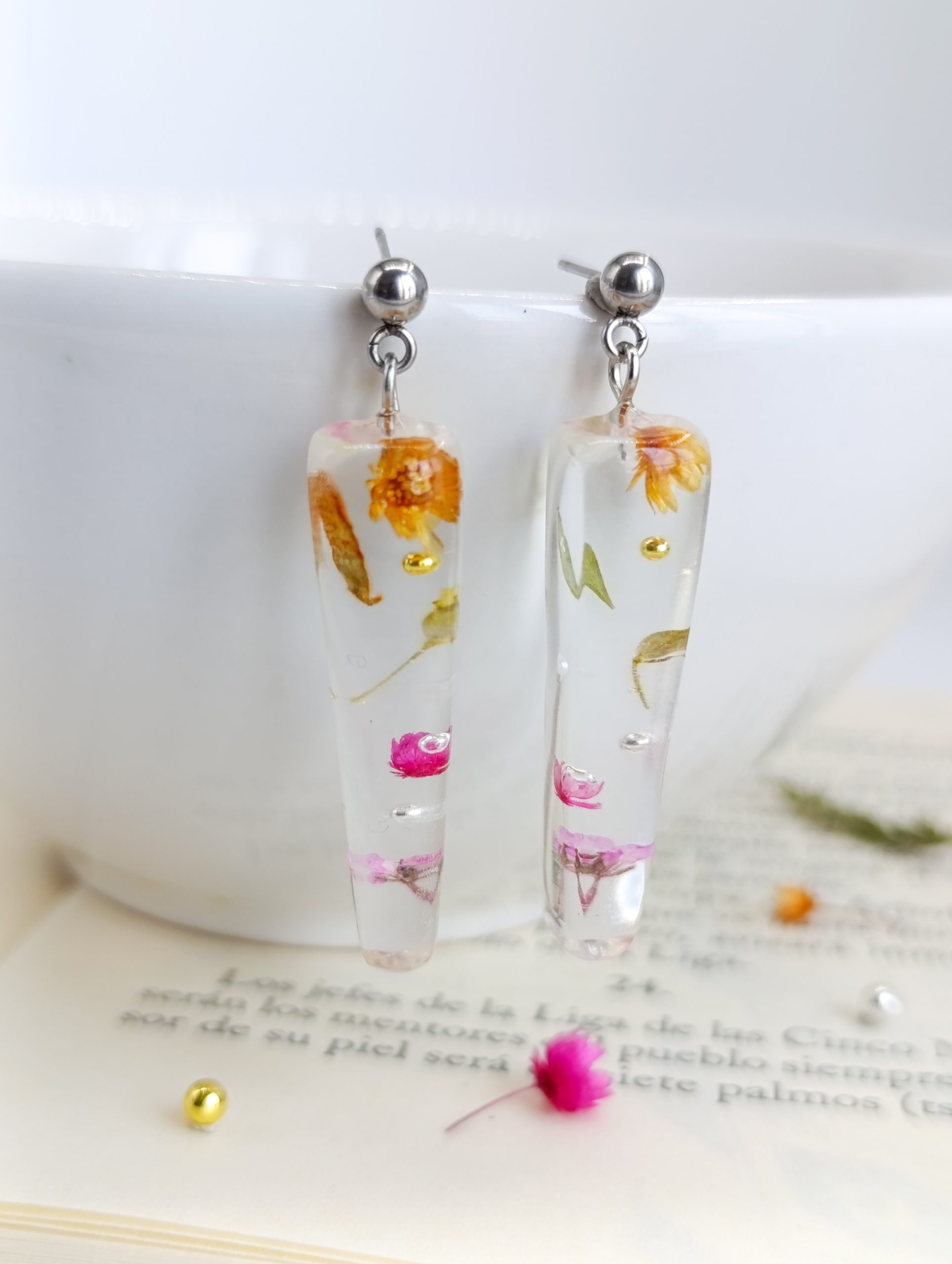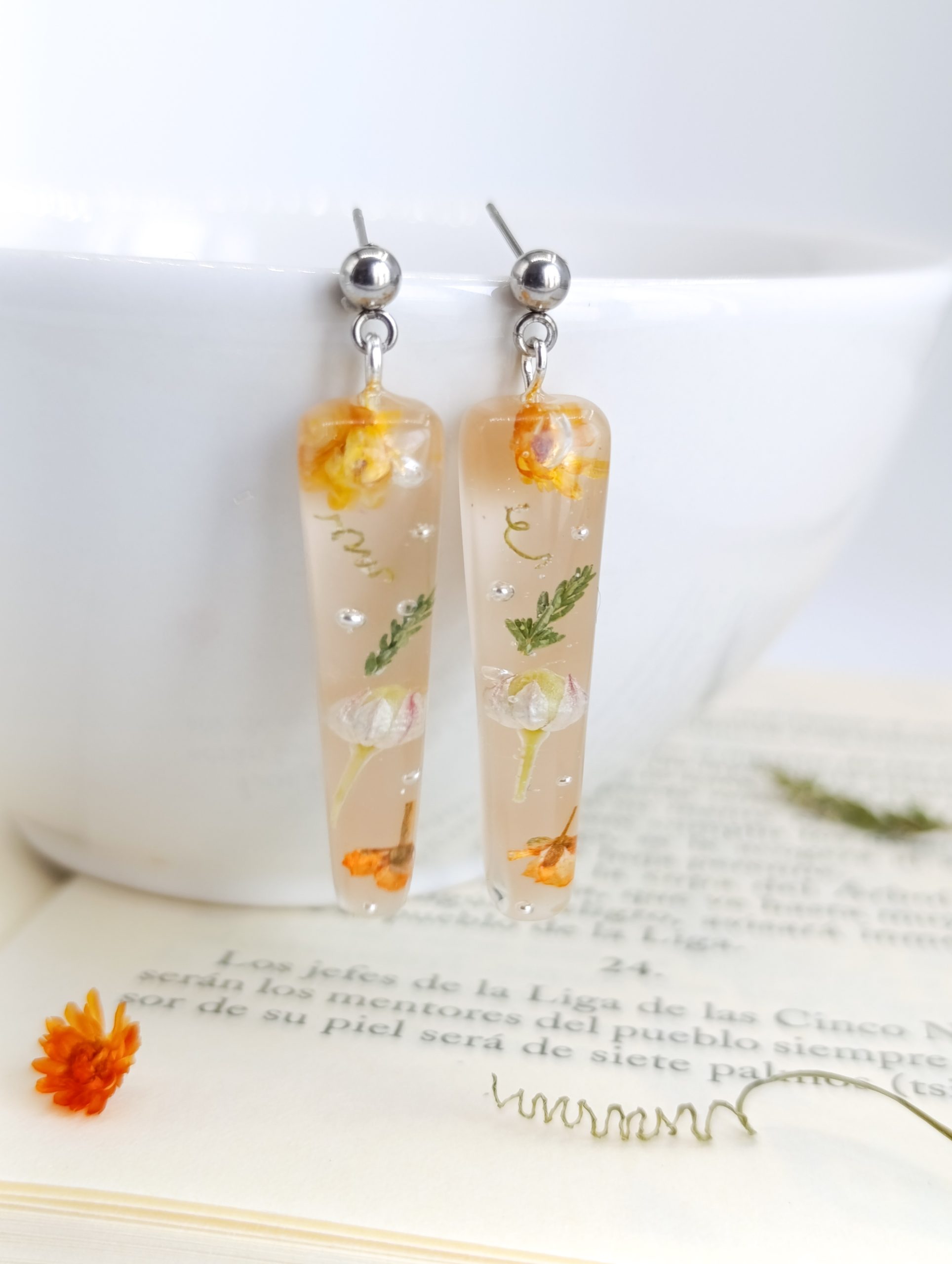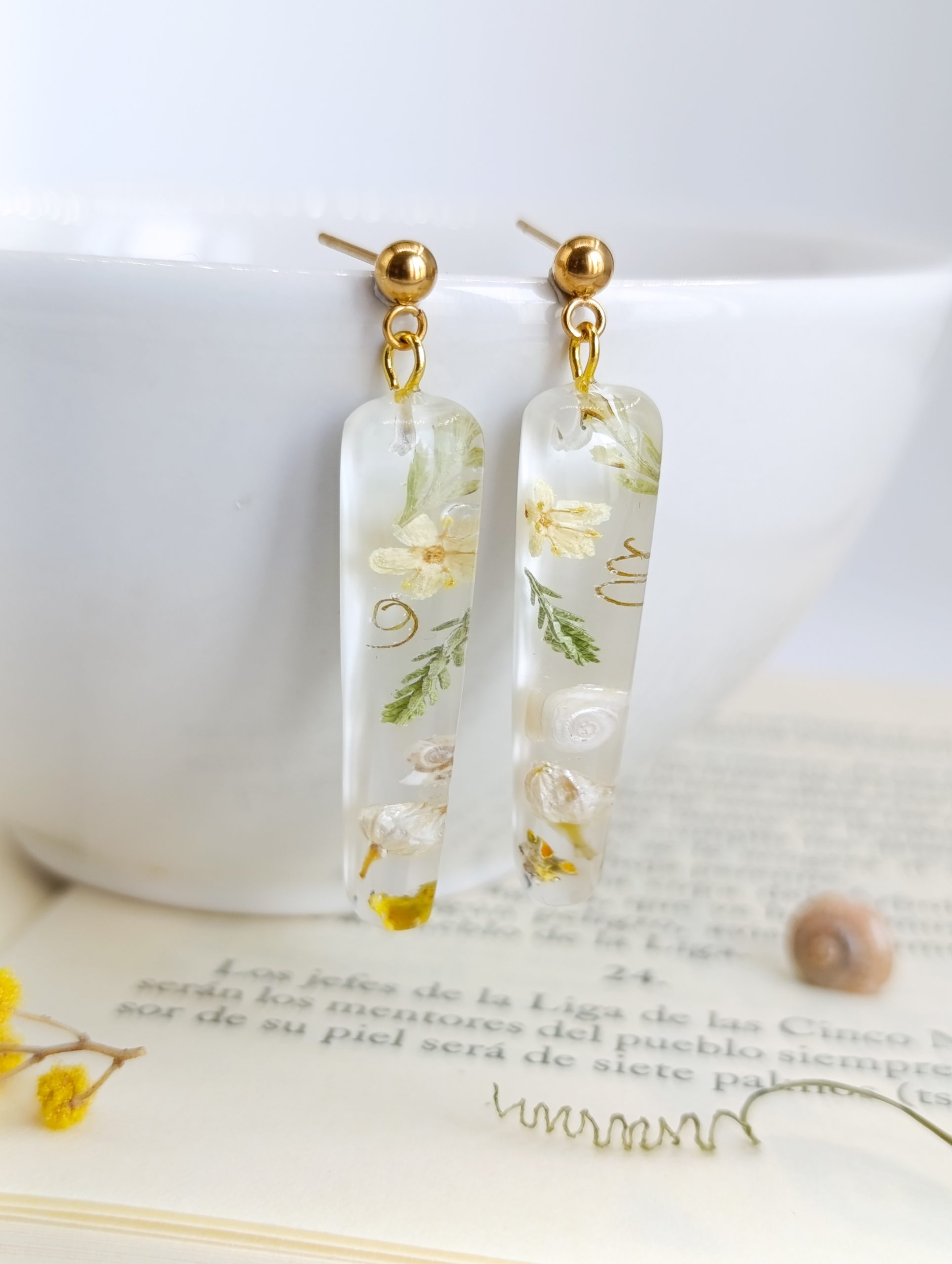 Pendientes largos de resina con flores naturales, inspirados en el momento efímero de soplar un deseo eterno. Cuatro diseños con fondo único.
