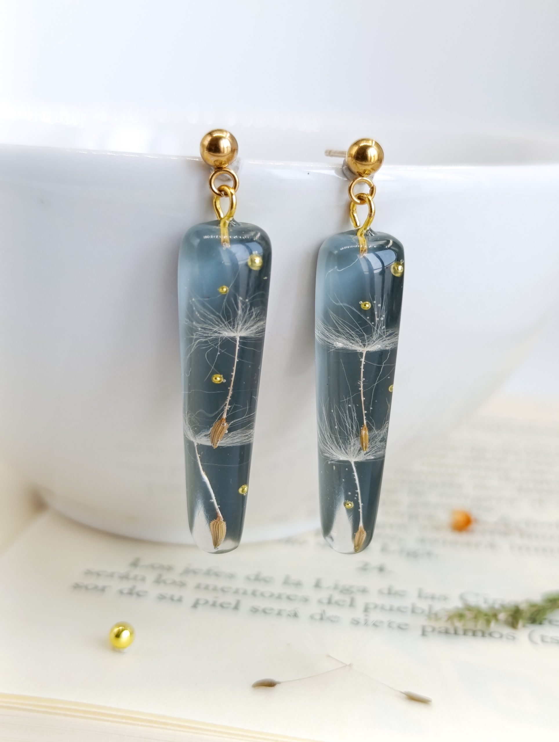 Estos pendientes largos de resina encapsulan flores naturales y el instante mágico de soplar un deseo.