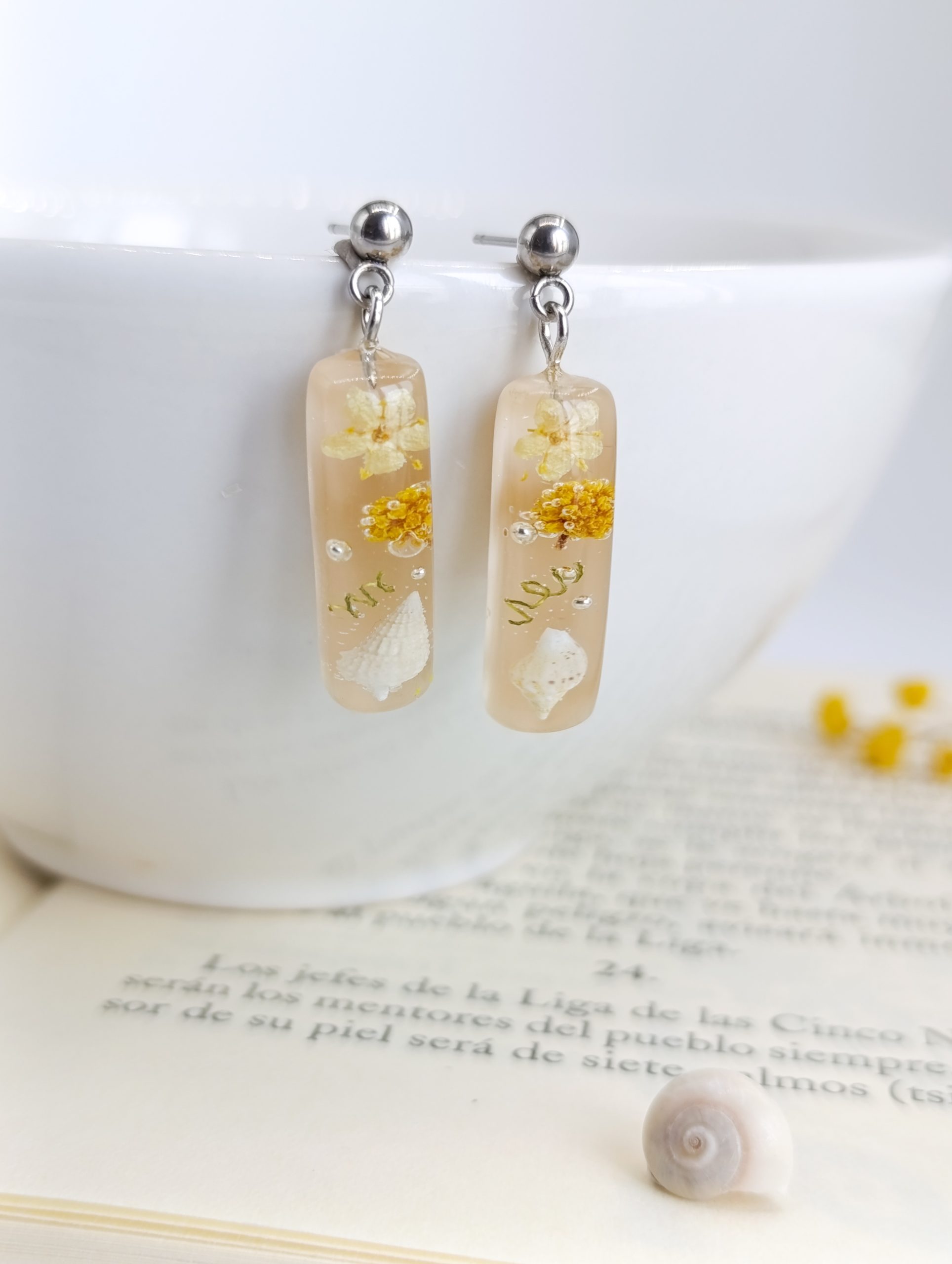 Pendientes mini alargados con acabado en dorado o plateado, elaborados artesanalmente en resina de alta calidad. En su interior, pequeñas flores y caracolas marinas quedan suspendidas como si flotaran, capturando el instante efímero de soplar un deseo eterno.