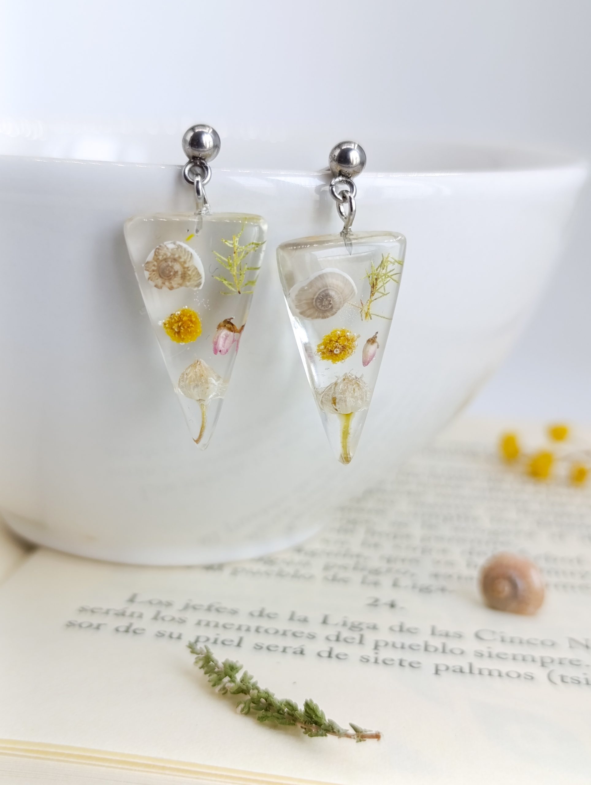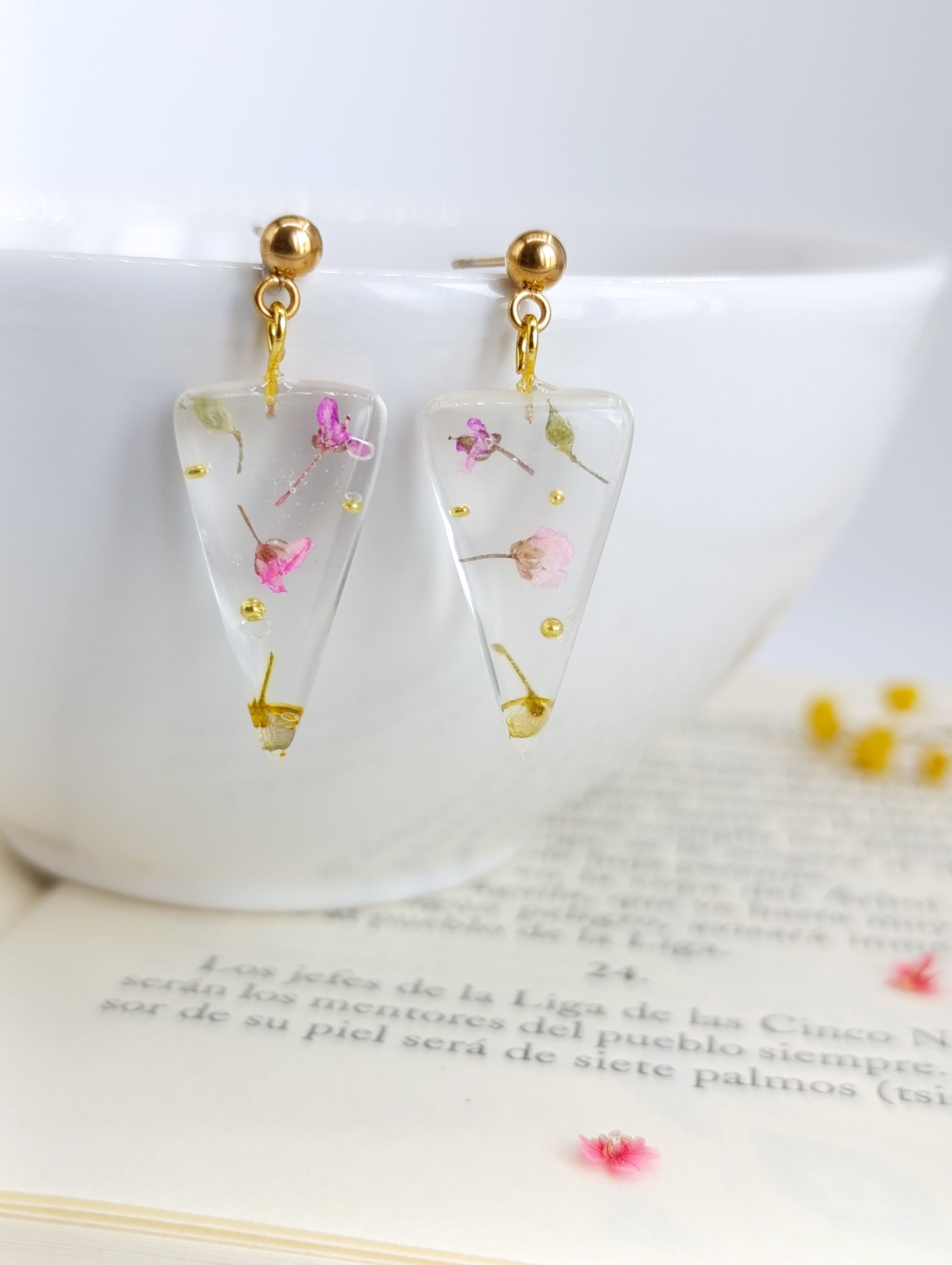 Pendientes triangulares elaborados de forma artesanal en resina de alta calidad, con flores naturales y elementos botánicos cuidadosamente preservados.