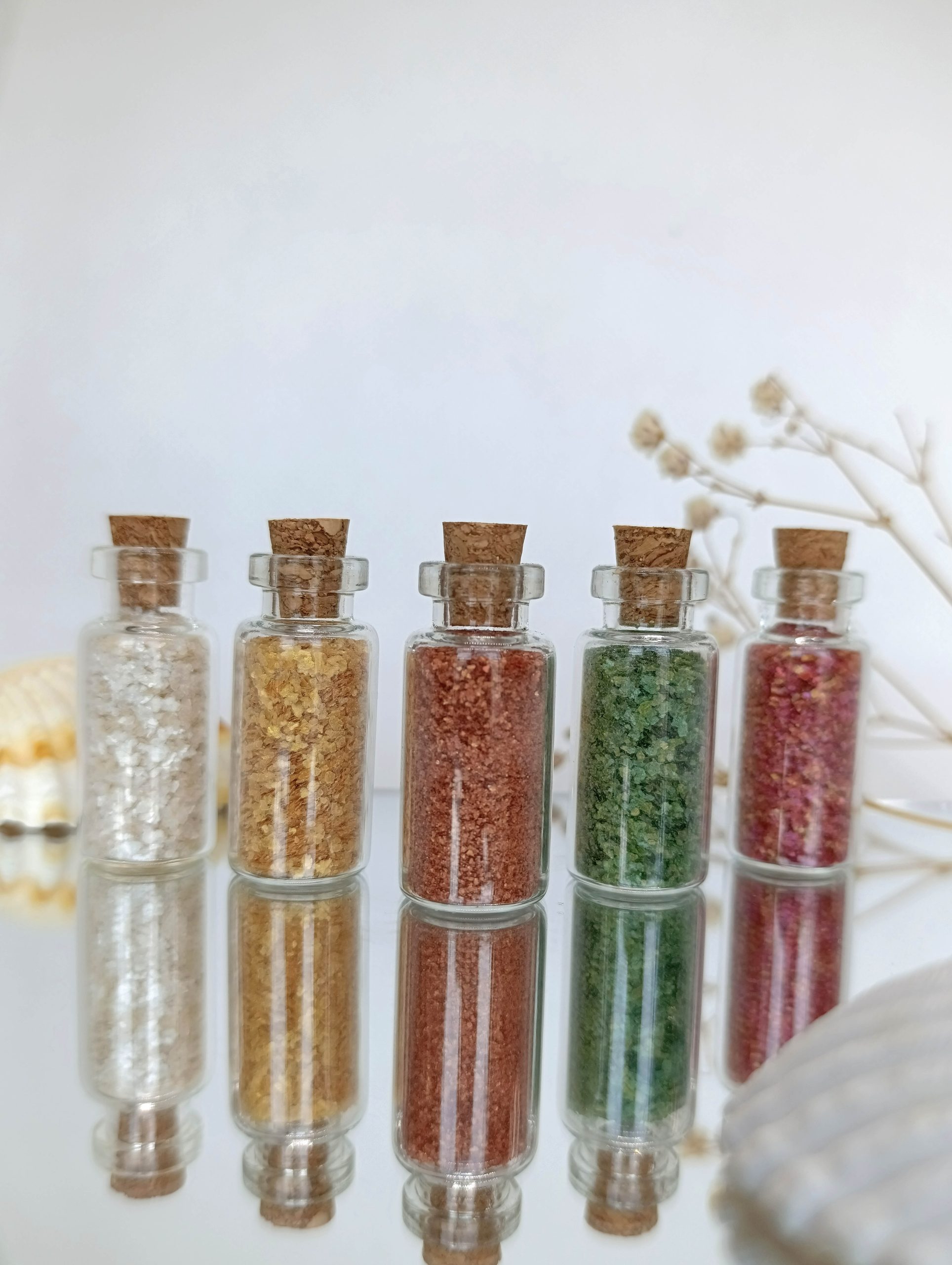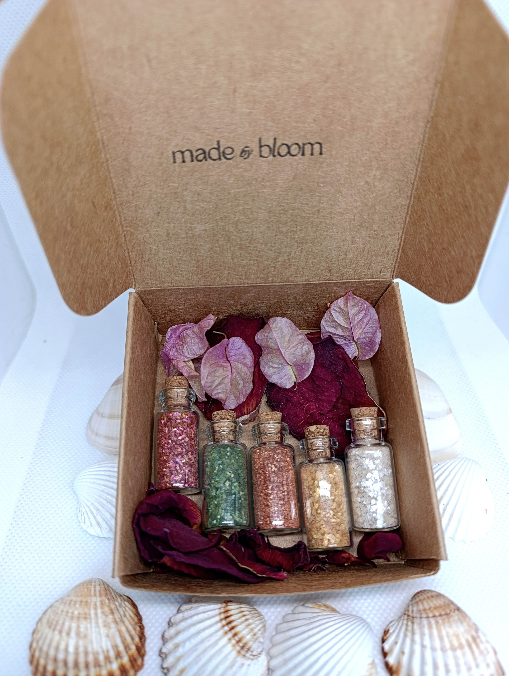 Este set incluye 5 frascos tamaño S en Bronce (fino), Brillo Rojo, Verde Oliva, Dorado y Blanco Perla. Ideal para quienes buscan un estilo natural y creativo, permite crear looks únicos y versátiles que resaltan tu individualidad.
