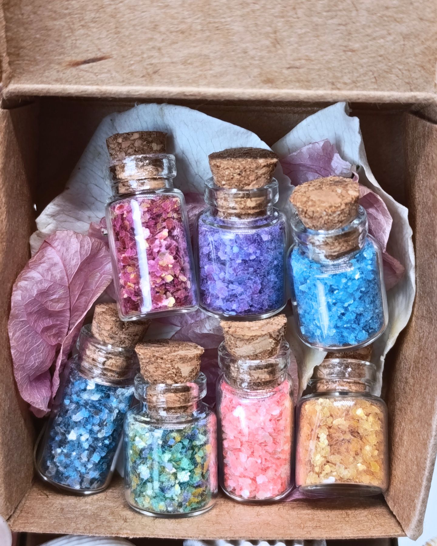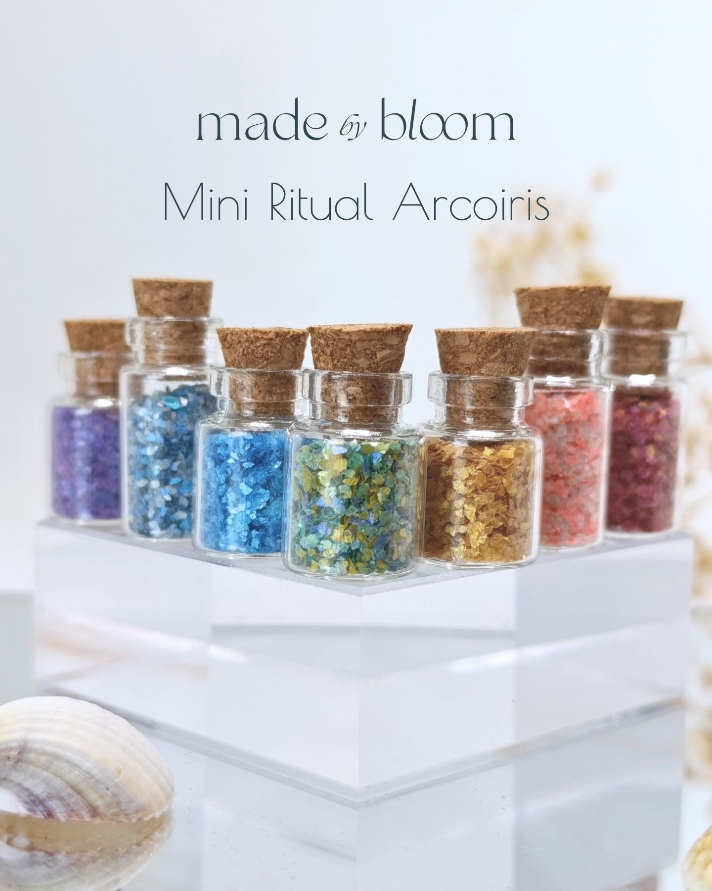 Mini Ritual Diversidad Arcoiris: 7 frascos tamaño XS en cristal, con los mismos tonos.