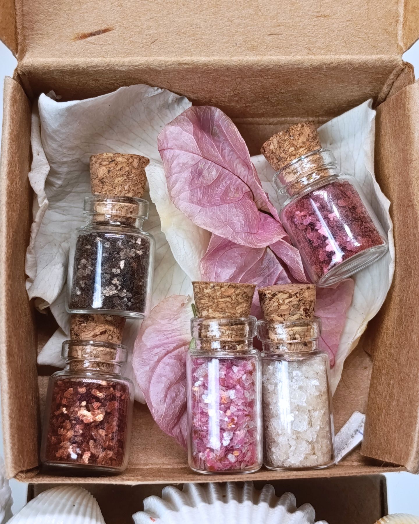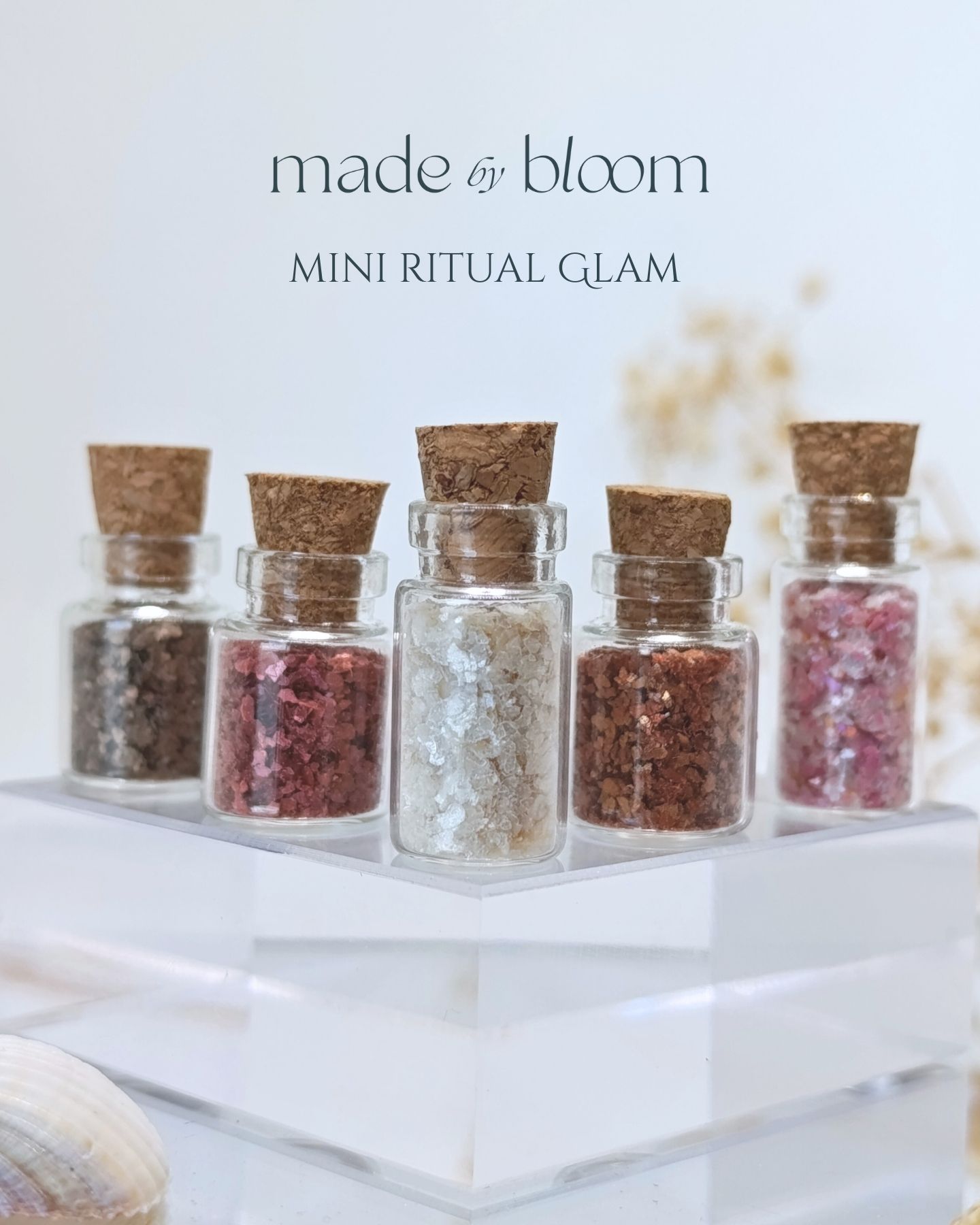 Mini Ritual Glam: 5 frascos tamaño XS en cristal, con los mismos tonos.