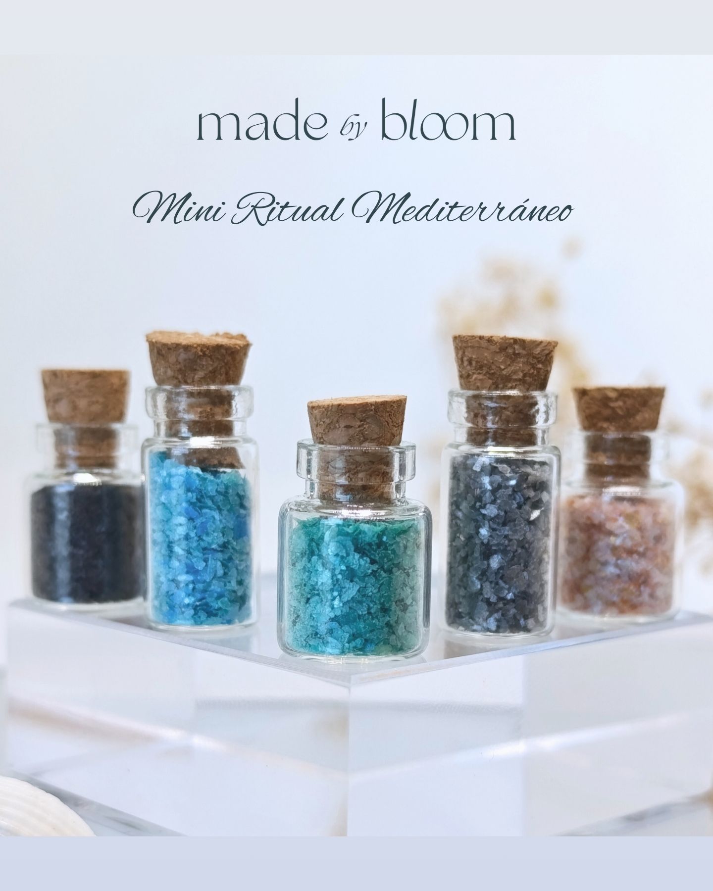 Mini Ritual Mediterráneo: 5 frascos tamaño XS en cristal, con los mismos tonos.