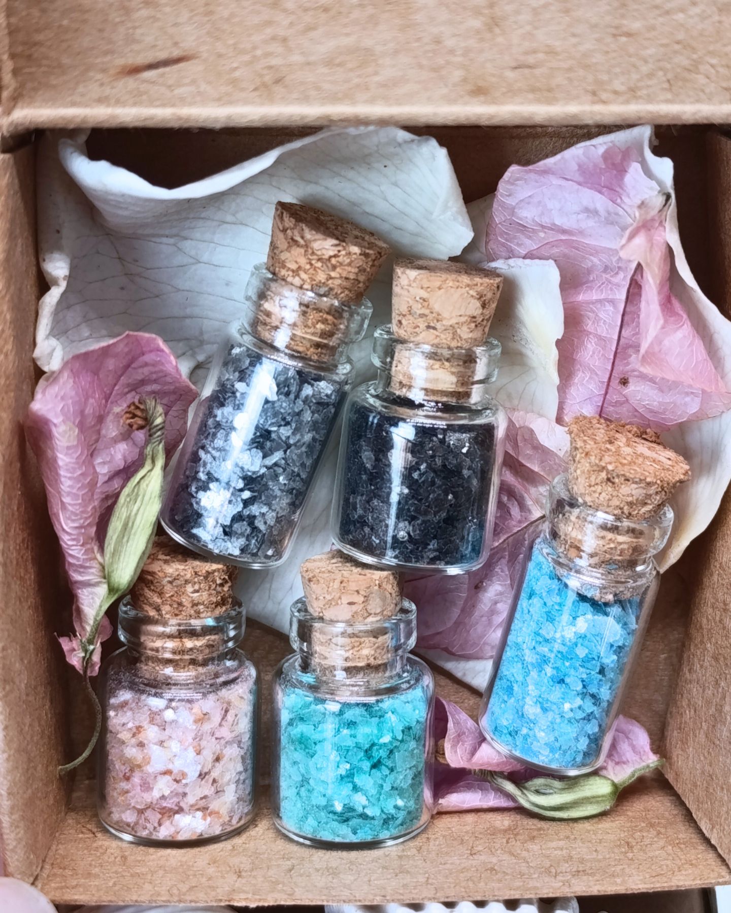 Ritual Mediterráneo: 5 frascos tamaño S en escamas (Azul profundo, Verde esmeralda, Blanco perla, Arena dorada y Negro volcánico).