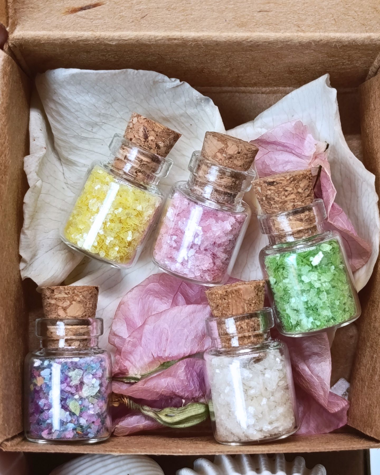 Mini Ritual Primavera: 5 frascos tamaño XS en cristal, con los mismos tonos.