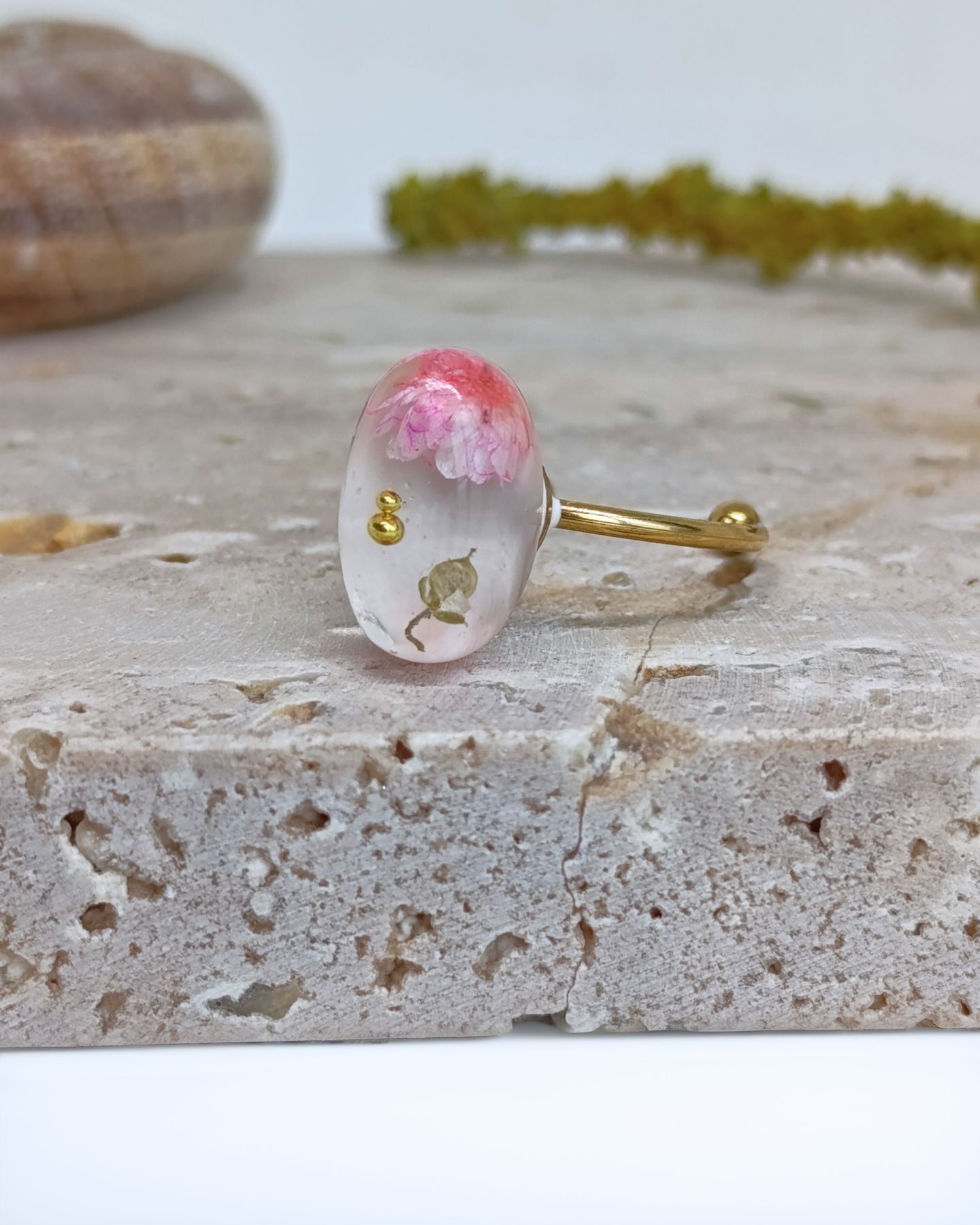 Este anillo botánico artesanal está elaborado a mano con resina de alta calidad, flores naturales y base de acero inoxidable (baño dorado o plateado).