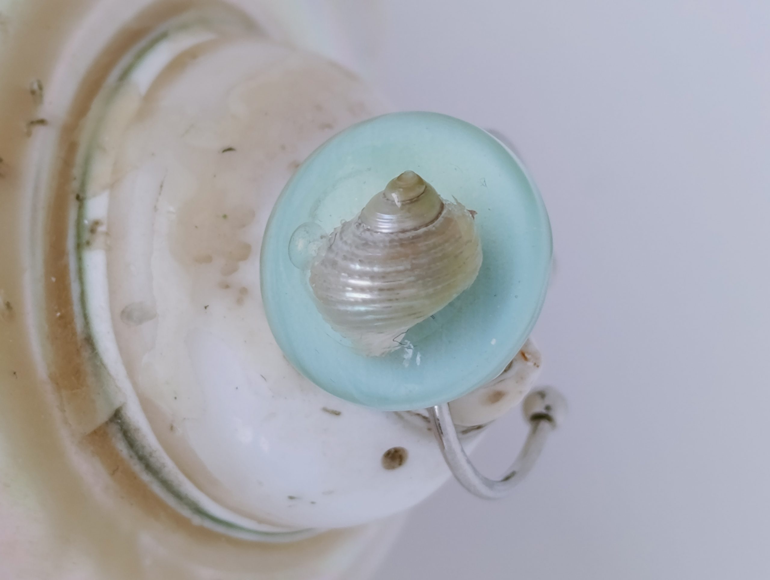 Anillo ajustable de acero inoxidable con caracol nacarado natural y fondo azul hielo.