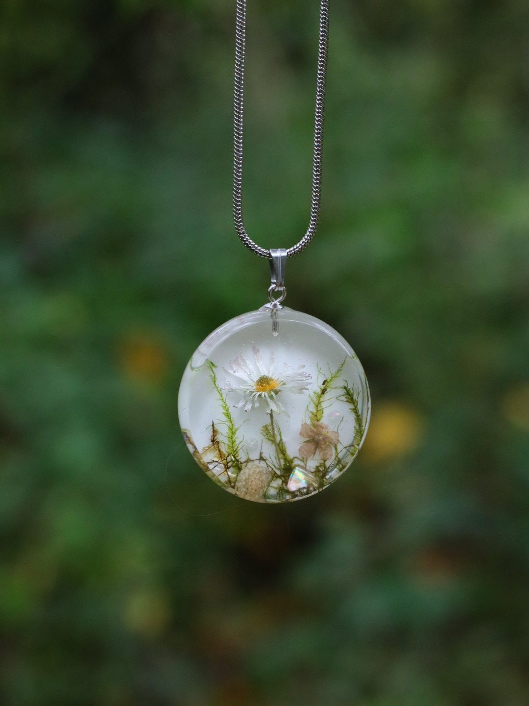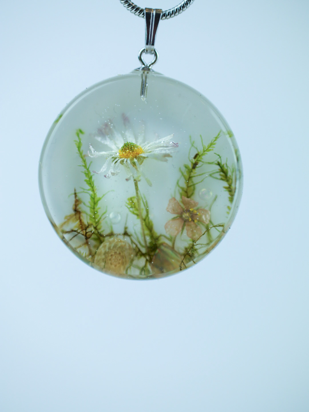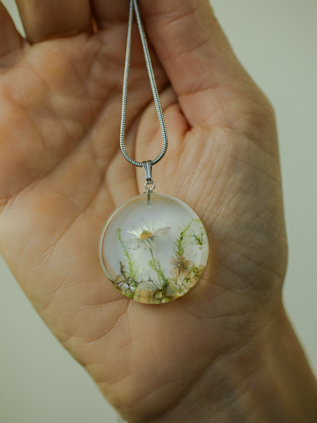 Este colgante plano mediano “Mundo de Hadas” encierra en su interior un pequeño paisaje natural: una flor silvestre rodeada de destellos de nácar y brillos en tonos suaves, suspendidos en un cabujón de calma.
