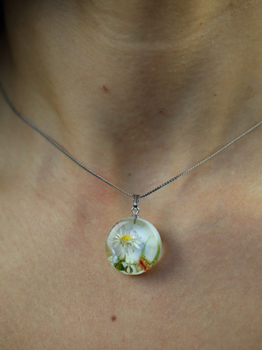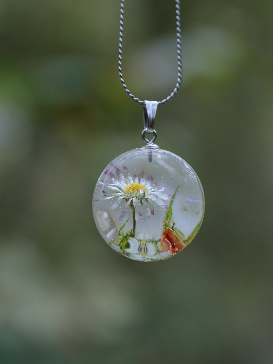 Dentro de su forma se esconde una pequeña flor silvestre rodeada de nácar y brillos sutiles, un paisaje diminuto que parece flotar en silencio.