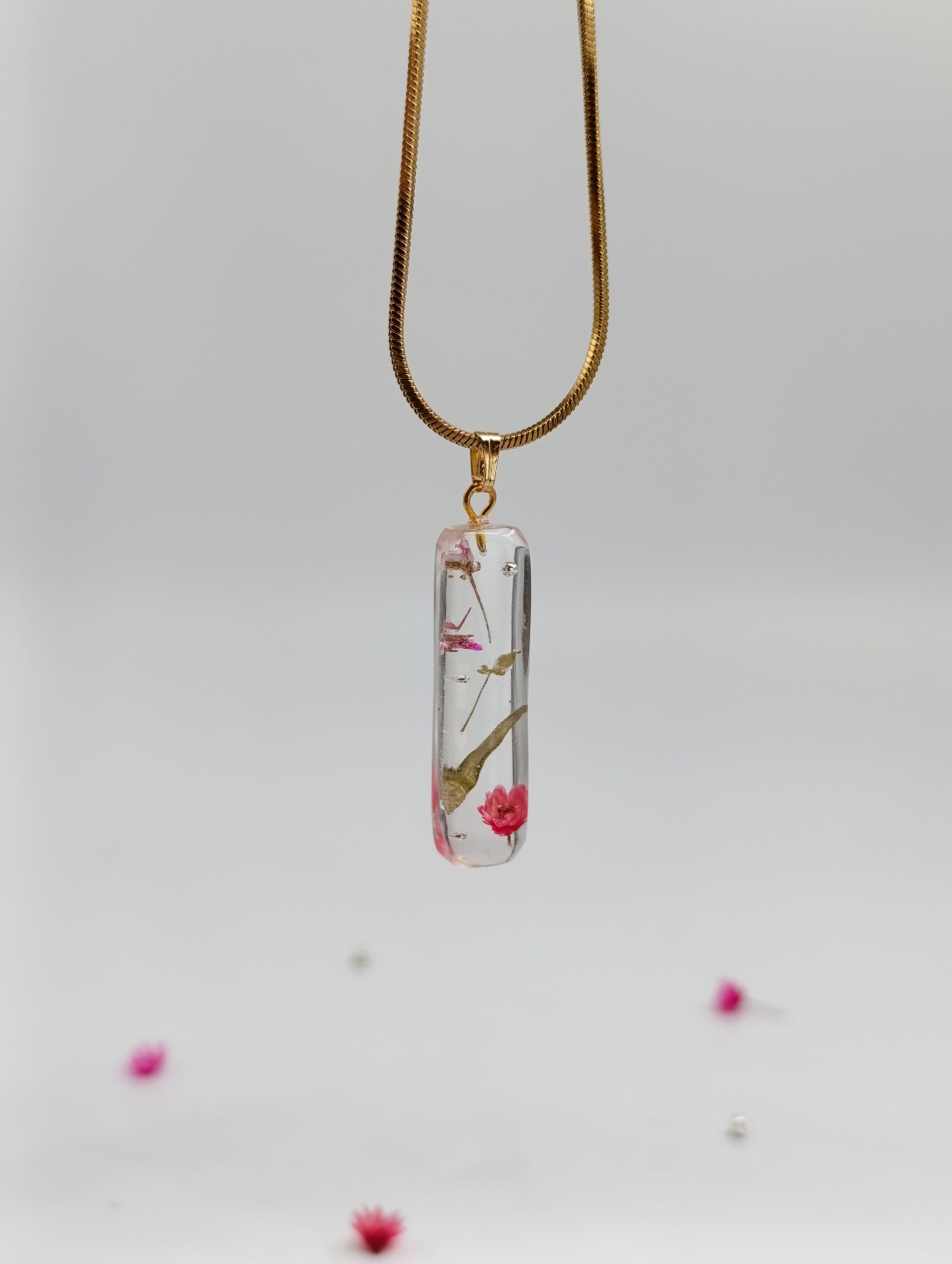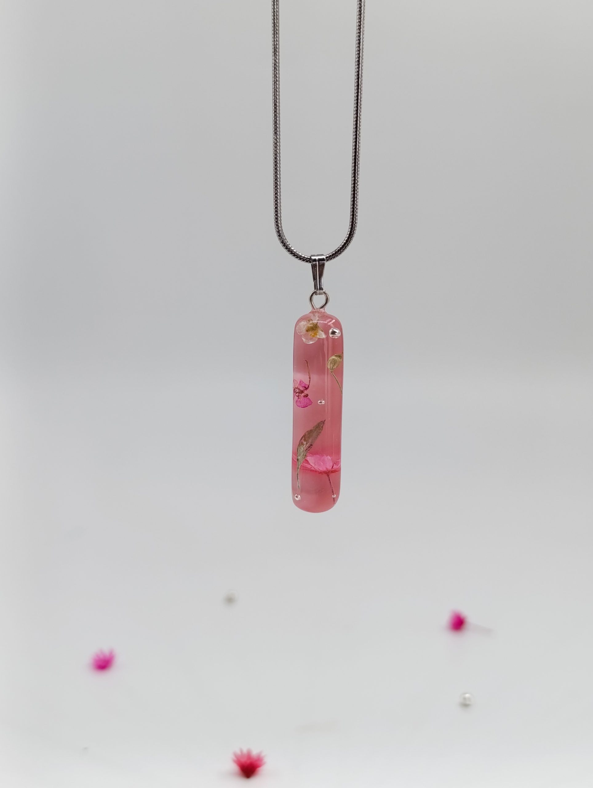 Elaborado a mano con flores naturales preservadas y resina de alta calidad, cada colgante es único. Su diseño alargado estiliza, y la cadena de acero inoxidable ajustable garantiza comodidad y durabilidad.