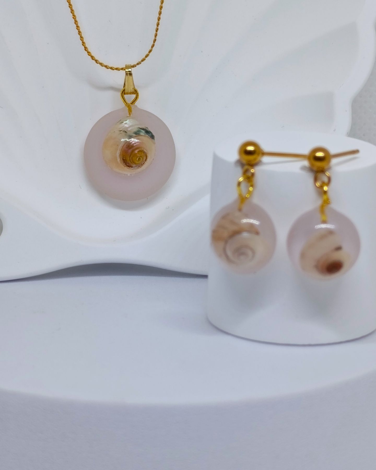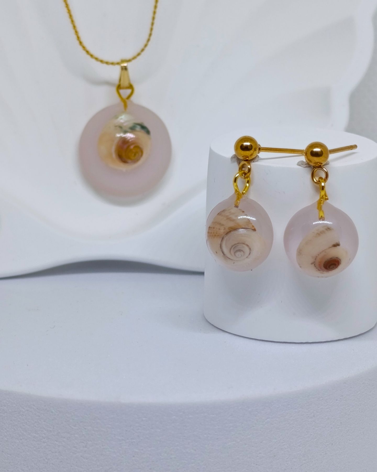 Conjunto artesanal en resina con caracolitos nacarados sobre fondo rosa. Dulzura y serenidad marina.