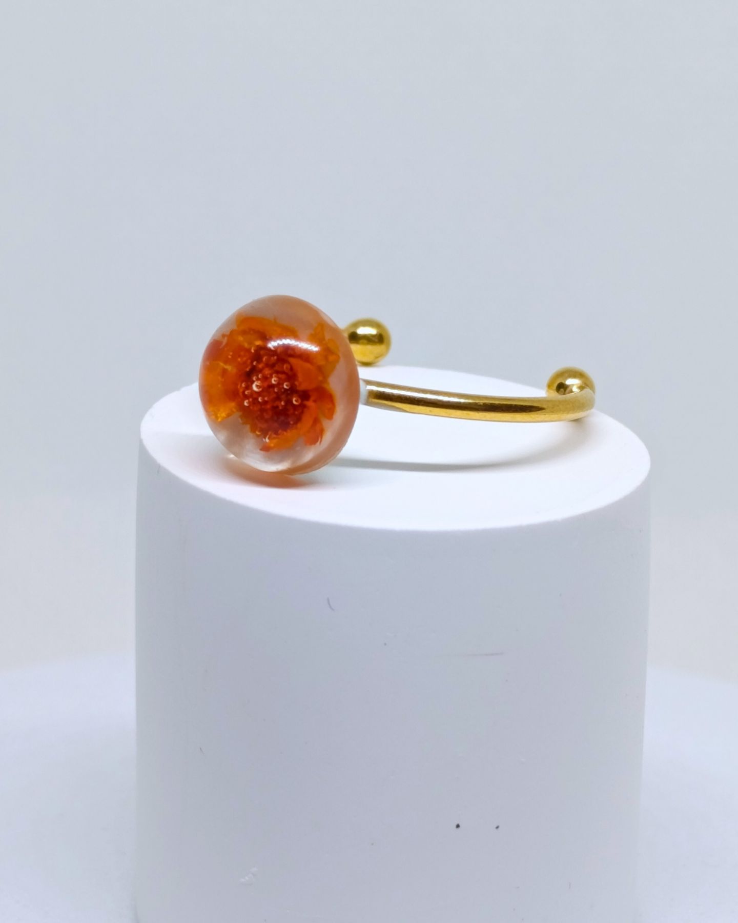 Conjunto artesanal en resina con flores de siempreviva natural. Aporta energía vital y un brillo alegre.