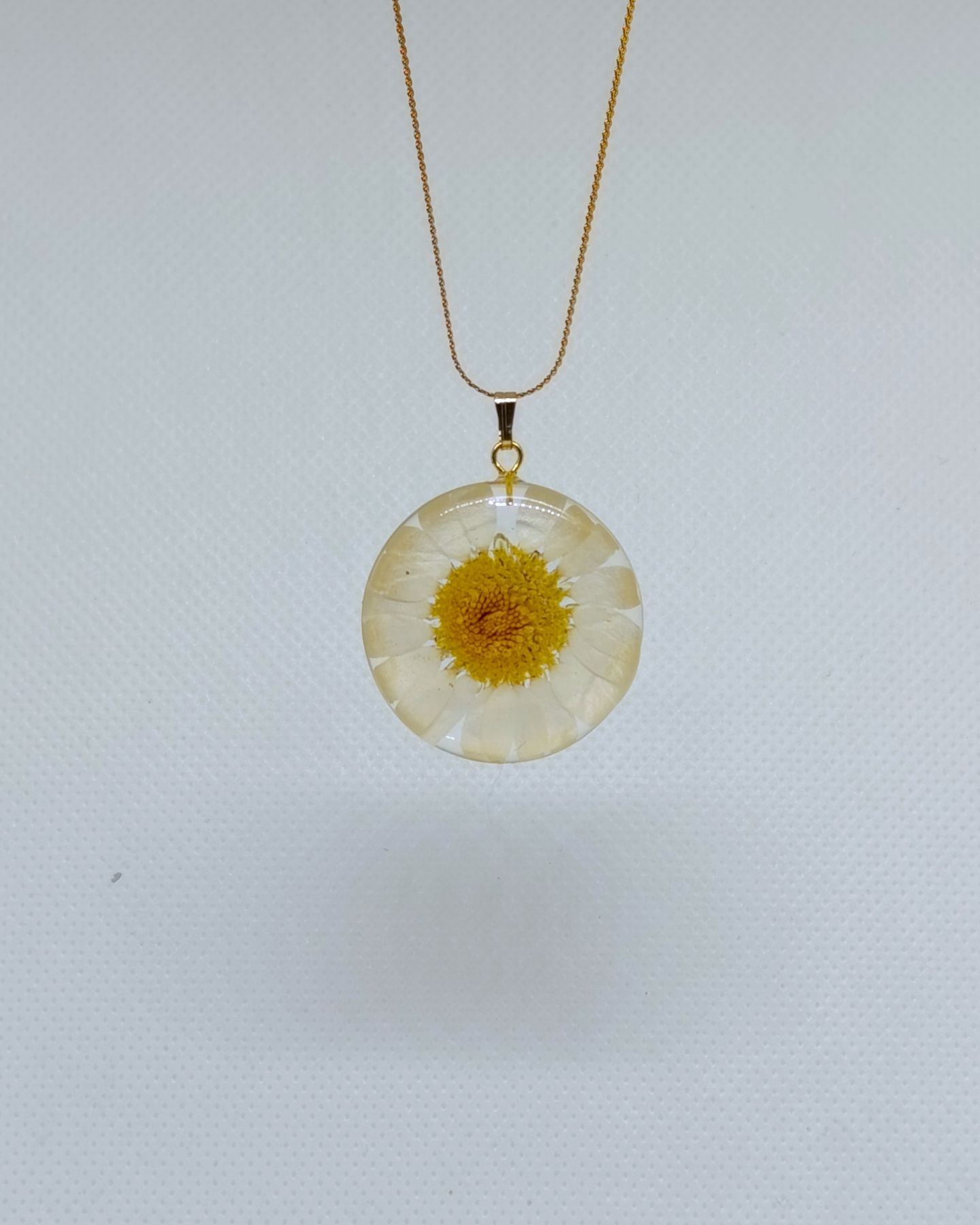 Conjunto artesanal en resina con margaritas blancas naturales. Atemporal, puro y romántico.