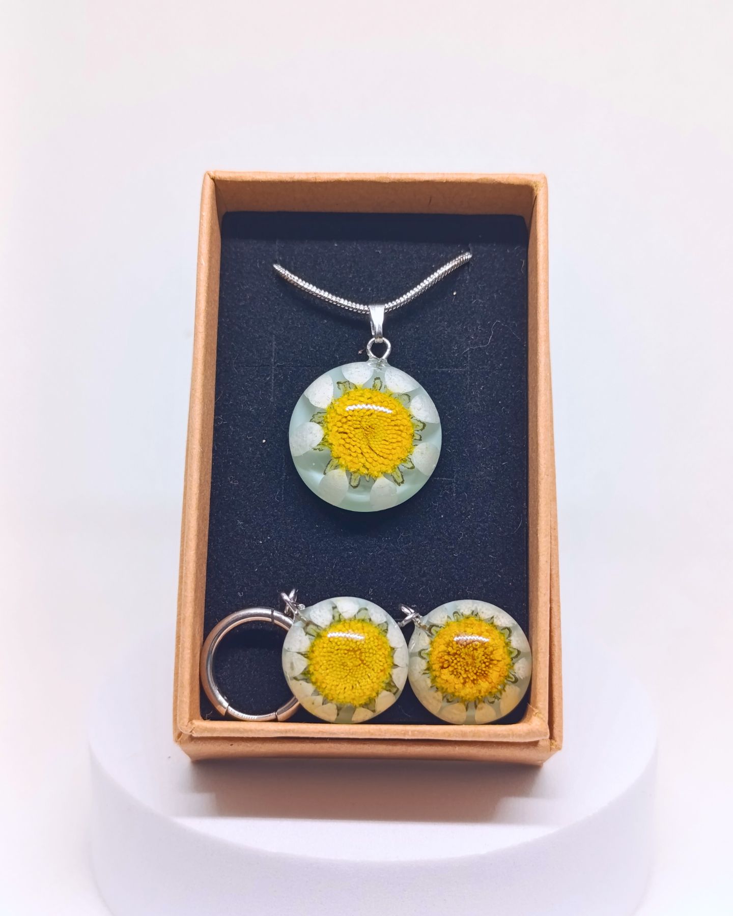 Este conjunto botánico artesanal está elaborado a mano con resina de alta calidad, margaritas naturales y bases de acero inoxidable (baño dorado o plateado).