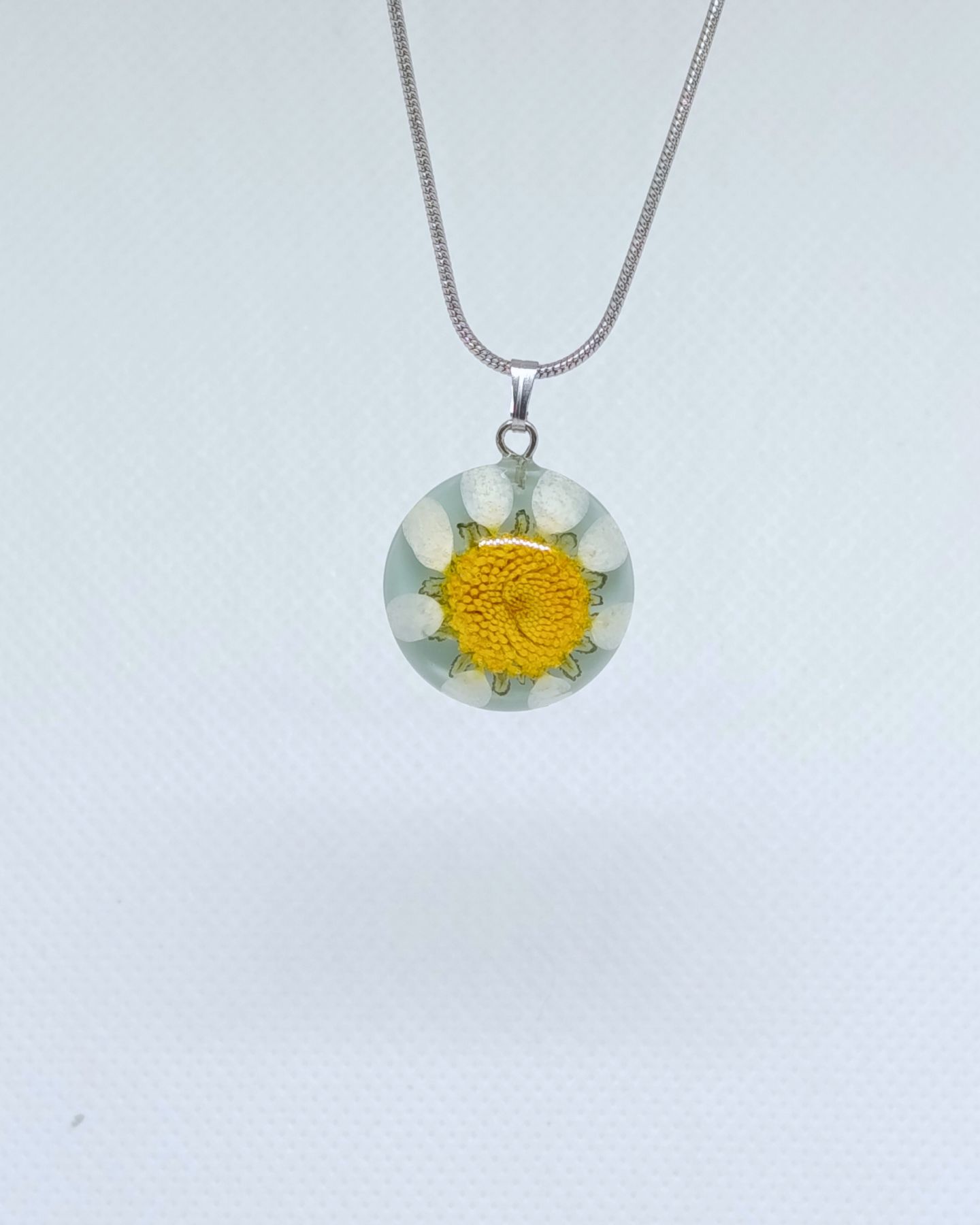 Conjunto artesanal con margaritas naturales sobre fondo azul. Romántico y optimista, un amuleto de frescura y alegría.