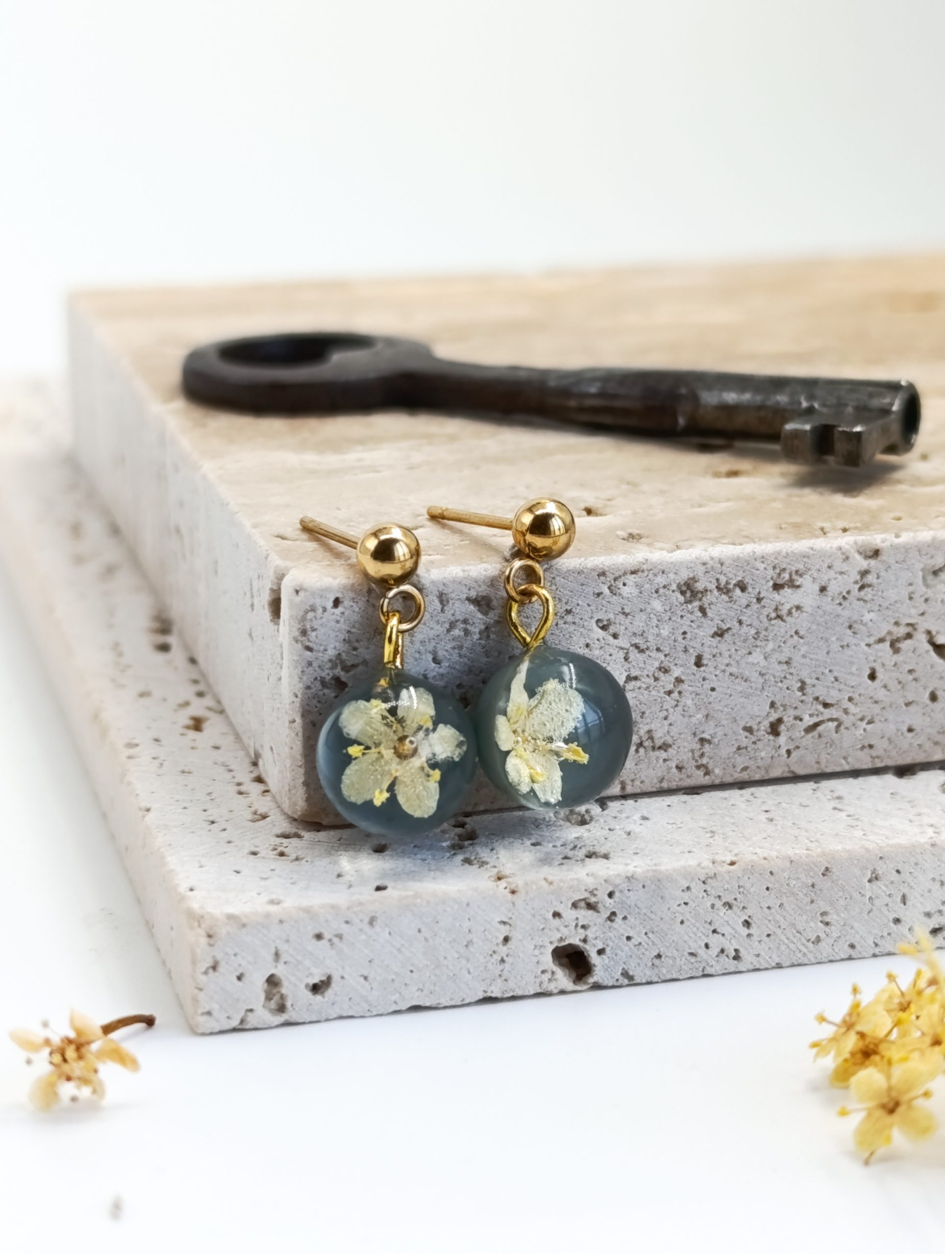 Los pendientes Mini de Made by Bloom están elaborados a mano con resina de alta calidad y elementos naturales, montados en acero inoxidable.