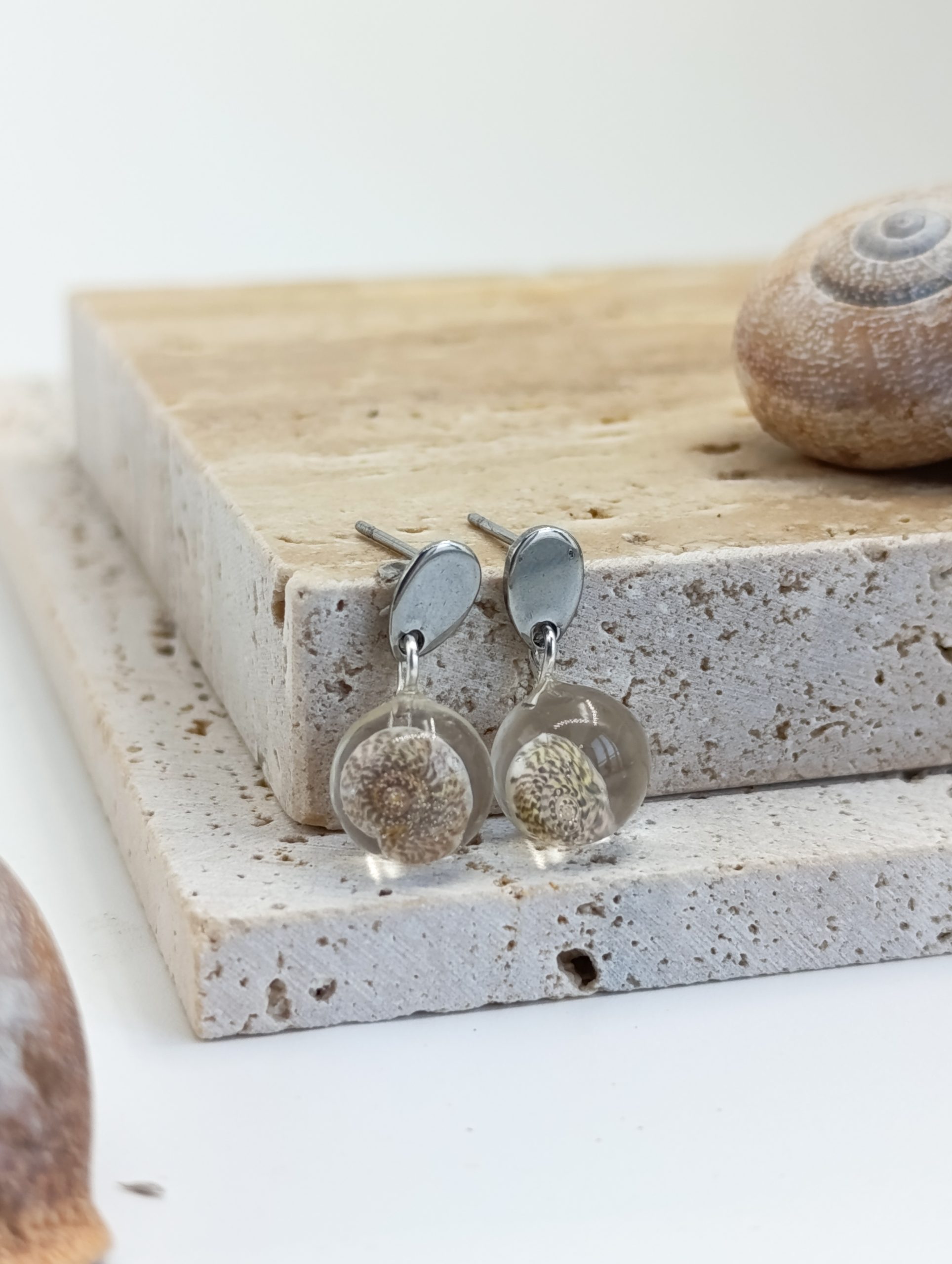 Pendientes mini de resina con elementos naturales: flor silvestre o caracol. Hechos a mano en acero dorado o plateado.