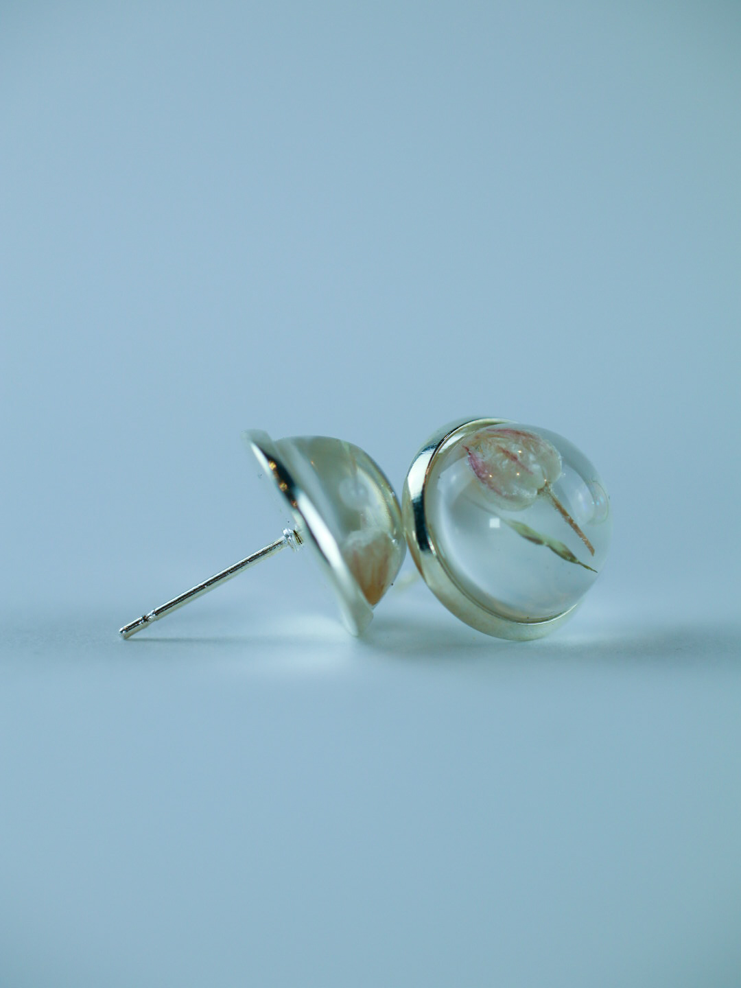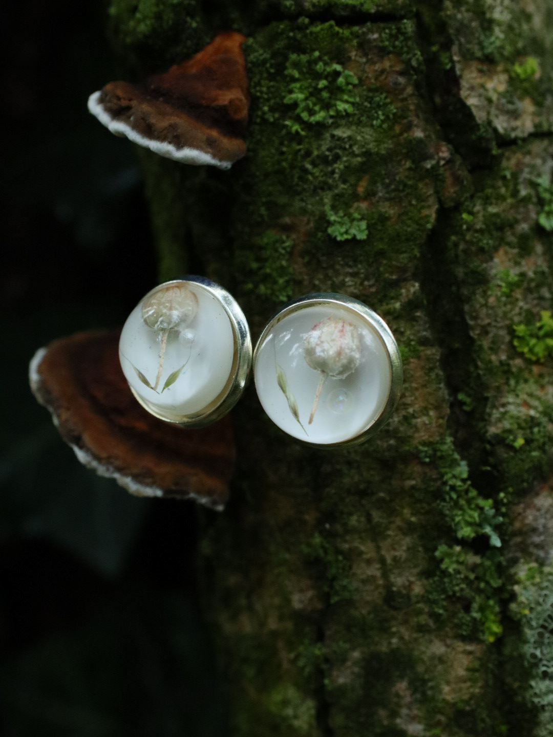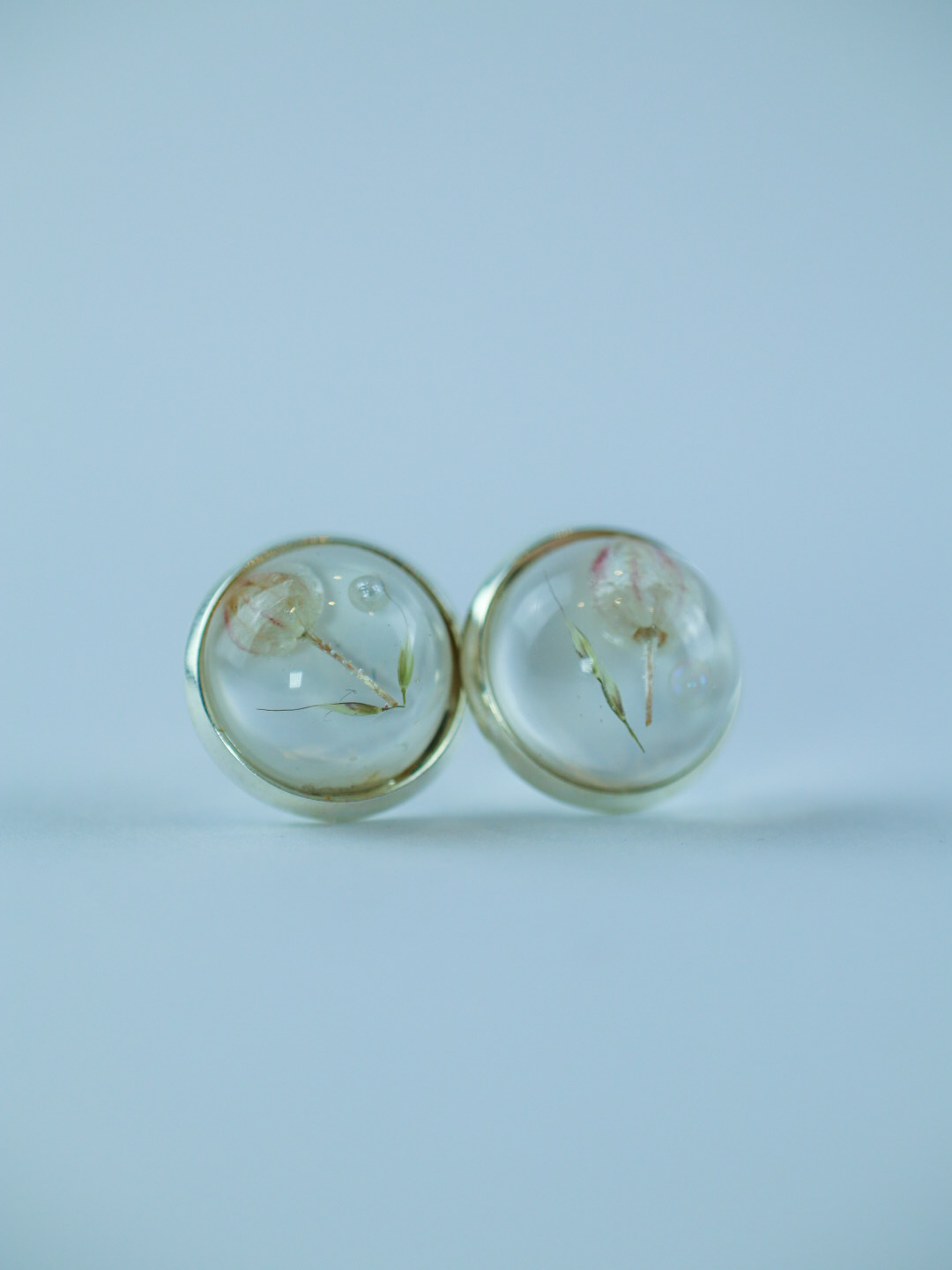 Pendientes de botón con flor y hoja natural suspendidas en resina brillante tipo vidrio.