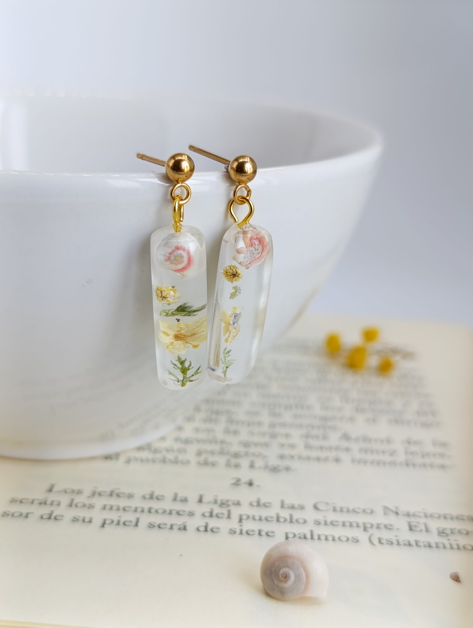 Pendientes de resina con flores naturales flotando. Joyería artesanal en acero inoxidable dorado o plateado, inspirada en El Primer Aliento.