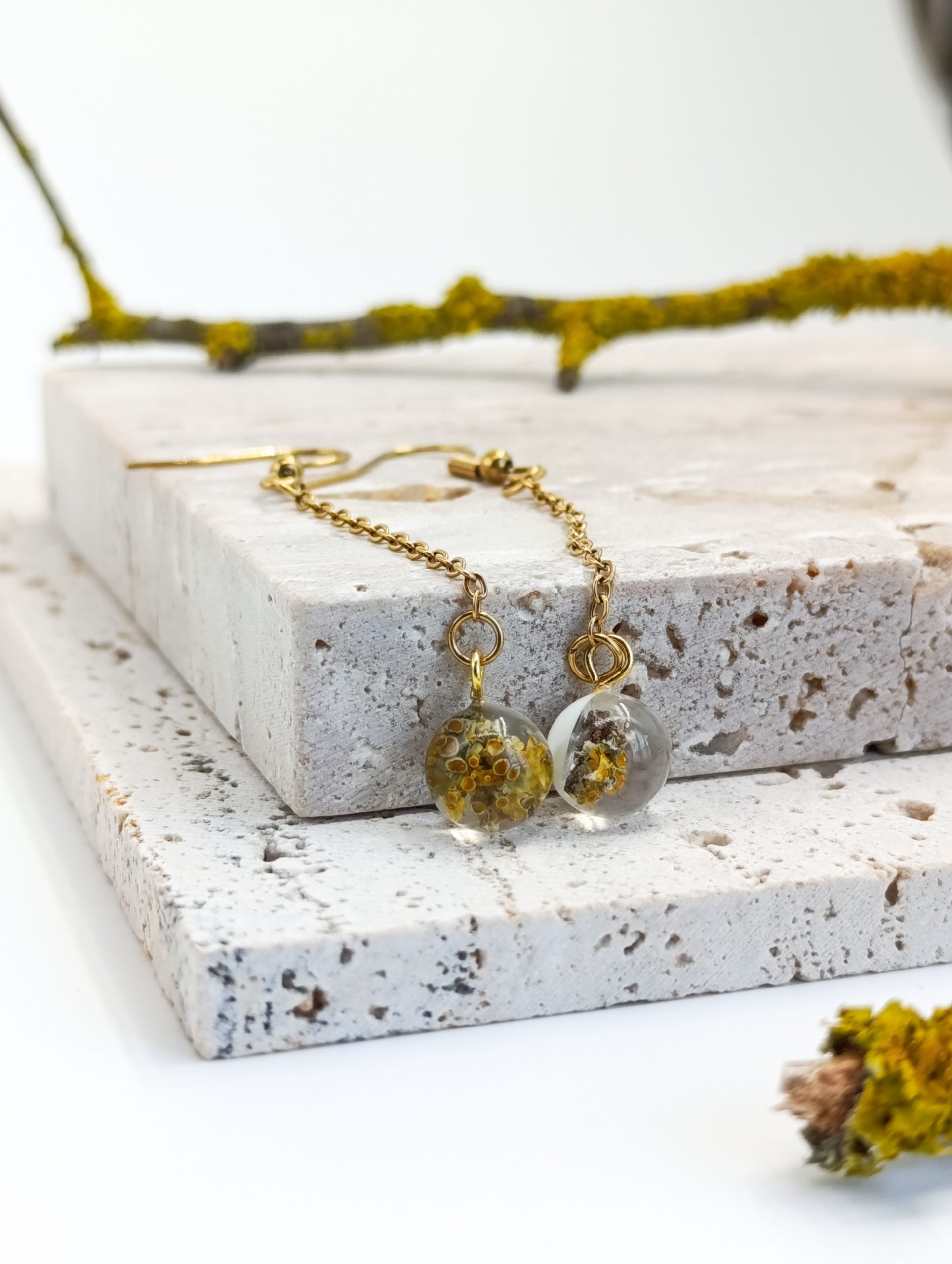 Estos pendientes de cadena están elaborados a mano con resina de alta calidad y liquen natural, montados en acero inoxidable dorado o plateado.